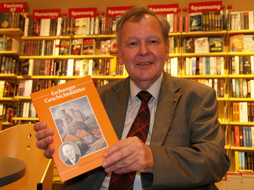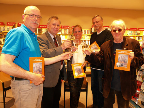 | Der Schriftführer des Zweigvereins Eschwege, York-Egbert König (links), Prof. Dr. Niklot Klüßendorf (zweiter v. links), Beatrix Amon (dritte v. links), Hermann Josef Friske (zweiter v. rechts) und der Vorsitzende des Zweigvereins Eschwege, Dr. Karl Kollmann (rechts), stellen den 25. Band der Eschweger Geschichtsblätter vor. |