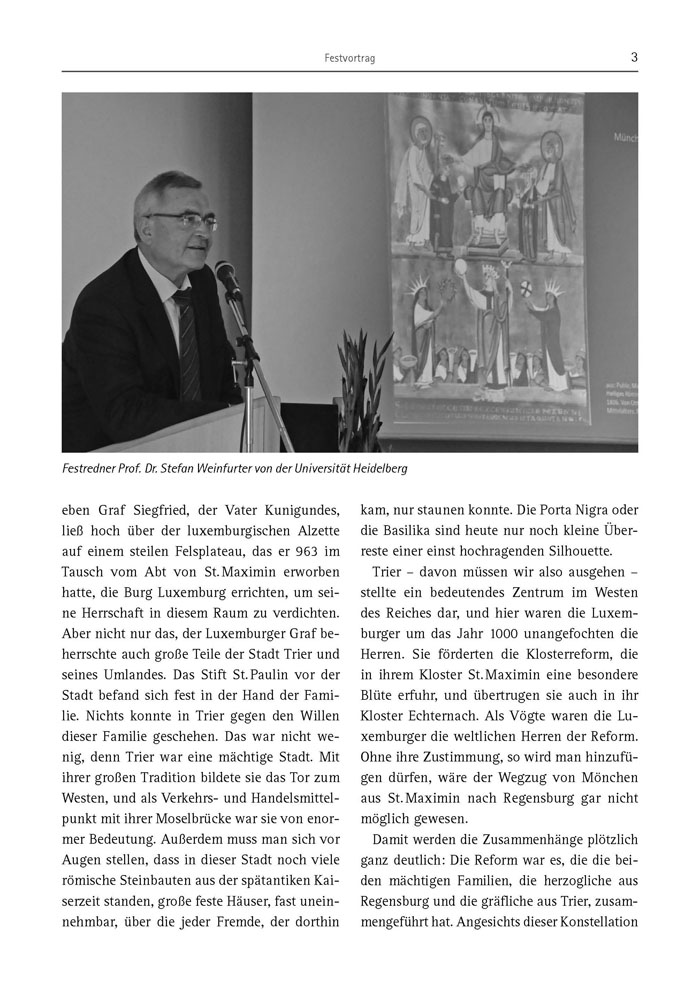 Trier – davon müssen wir also ausgehen – stellte ein bedeutendes Zentrum im Westen des Reiches dar, und hier waren die Luxemburger um das Jahr 1000 unangefochten die Herren. Sie förderten die Klosterreform, die in ihrem Kloster St. Maximin eine besondere Blüte erfuhr, und übertrugen sie auch in ihr Kloster Echternach. Als Vögte waren die Luxemburger die weltlichen Herren der Reform. Ohne ihre Zustimmung, so wird man hinzufügen dürfen, wäre der Wegzug von Mönchen aus St. Maximin nach Regensburg gar nicht möglich gewesen.