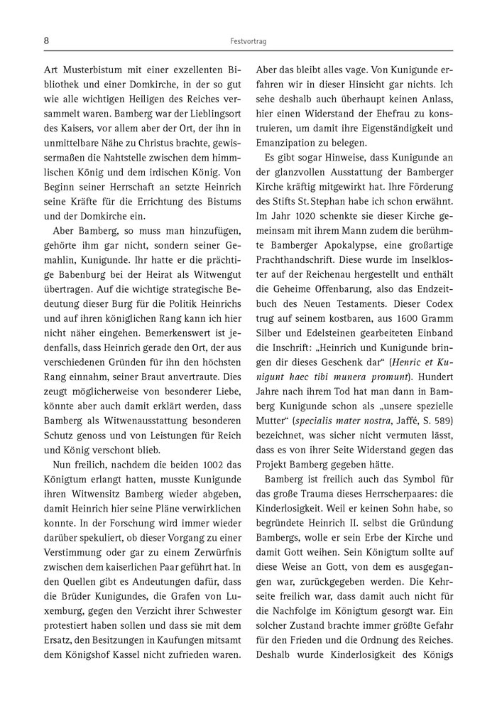 Aber Bamberg, so muss man hinzufügen, gehörte ihm gar nicht, sondern seiner Gemahlin, Kunigunde. Ihr hatte er die prächtige Babenburg bei der Heirat als Witwengut übertragen. Auf die wichtige strategische Bedeutung dieser Burg für die Politik Heinrichs und auf ihren königlichen Rang kann ich hier nicht näher eingehen. Bemerkenswert ist jedenfalls, dass Heinrich gerade den Ort, der aus verschiedenen Gründen für ihn den höchsten Rang einnahm, seiner Braut anvertraute. Dies zeugt möglicherweise von besonderer Liebe, könnte aber auch damit erklärt werden, dass Bamberg als Witwenausstattung besonderen Schutz genoss und von Leistungen für Reich und König verschont blieb.