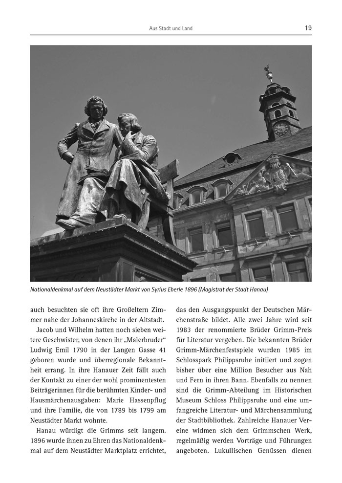 Jacob und Wilhelm hatten noch sieben weitere Geschwister, von denen ihr „Malerbruder“ Ludwig Emil 1790 in der Langen Gasse 41 geboren wurde und überregionale Bekanntheit errang. In ihre Hanauer Zeit fällt auch der Kontakt zu einer der wohl prominentesten Beiträgerinnen für die berühmten Kinder- und Hausmärchenausgaben: Marie Hassenpflug und ihre Familie, die von 1789 bis 1799 am Neustädter Markt wohnte.