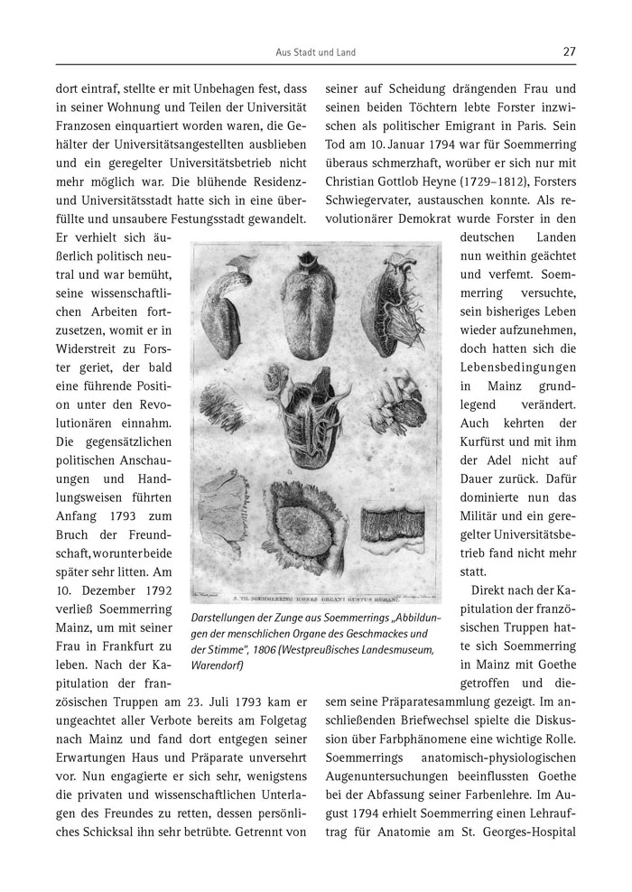 dort eintraf, stellte er mit Unbehagen fest, dass in seiner Wohnung und Teilen der Universität Franzosen einquartiert worden waren, die Gehälter der Universitätsangestellten ausblieben und ein geregelter Universitätsbetrieb nicht mehr möglich war. Die blühende Residenz- und Universitätsstadt hatte sich in eine überfüllte und unsaubere Festungsstadt gewandelt. Er verhielt sich äußerlich politisch neutral und war bemüht, seine wissenschaftlichen Arbeiten fortzusetzen, womit er in Widerstreit zu Forster geriet, der bald eine führende Position unter den Revolutionären einnahm. Die gegensätzlichen politischen Anschauungen und Handlungsweisen führten Anfang 1793 zum Bruch der Freundschaft, worunter beide später sehr litten. Am 10. Dezember 1792 verließ Soemmerring Mainz, um mit seiner Frau in Frankfurt zu leben. Nach der Kapitulation der französischen Truppen am 23. Juli 1793 kam er ungeachtet aller Verbote bereits am Folgetag nach Mainz und fand dort entgegen seiner Erwartungen Haus und Präparate unversehrt vor. Nun engagierte er sich sehr, wenigstens die privaten und wissenschaftlichen Unterlagen des Freundes zu retten, dessen persönliches Schicksal ihn sehr betrübte. Getrennt von seiner auf Scheidung drängenden Frau und seinen beiden Töchtern lebte Forster inzwischen als politischer Emigrant in Paris. Sein Tod am 10. Januar 1794 war für Soemmerring überaus schmerzhaft, worüber er sich nur mit Christian Gottlob Heyne (1729–1812), Forsters Schwiegervater, austauschen konnte. Als revolutionärer Demokrat wurde Forster in den deutschen Landen nun weithin geächtet und verfemt. Soemmerring versuchte, sein bisheriges Leben wieder aufzunehmen, doch hatten sich die Lebensbedingungen in Mainz grundlegend verändert. Auch kehrten der Kurfürst und mit ihm der Adel nicht auf Dauer zurück. Dafür dominierte nun das Militär und ein geregelter Universitätsbetrieb fand nicht mehr statt.