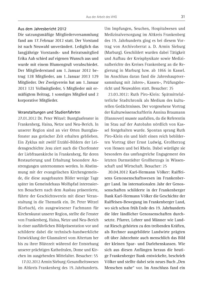 17.02.2012 Armin Sieburg: Gesundheitswesen im Altkreis Frankenberg des 19. Jahrhunderts. Um Impfungen, Seuchen, Hospitalwesen und Medizinalversorgung im Altkreis Frankenberg des 19. Jahrhunderts ging es bei diesem Vortrag von Archivoberrat a. D. Armin Sieburg (Marburg). Geschildert wurden dabei Tätigkeit und Aufbau der Kreisphysikate sowie Medizinalberichte des Kreises Frankenberg an die Regierung in Marburg bzw. ab 1866 in Kassel. Im Anschluss daran fand die Jahreshauptversammlung mit Jahres-, Kassen-, Prüfungsbericht und Neuwahlen statt. Besucher: 35