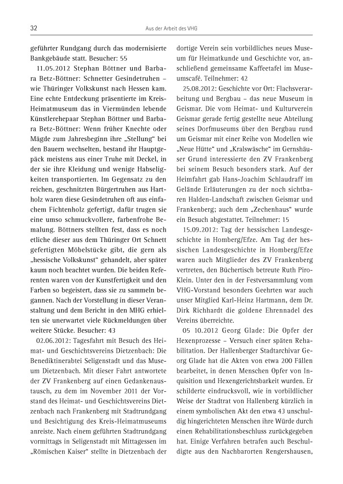 15.09.2012: Tag der hessischen Landesgeschichte in Homberg/Efze. Am Tag der hessischen Landesgeschichte in Homberg/Efze waren auch Mitglieder des ZV Frankenberg vertreten, den Büchertisch betreute Ruth Piro-Klein. Unter den in der Festversammlung vom VHG-Vorstand besonders Geehrten war auch unser Mitglied Karl-Heinz Hartmann, dem Dr. Dirk Richhardt die goldene Ehrennadel des Vereins überreichte.