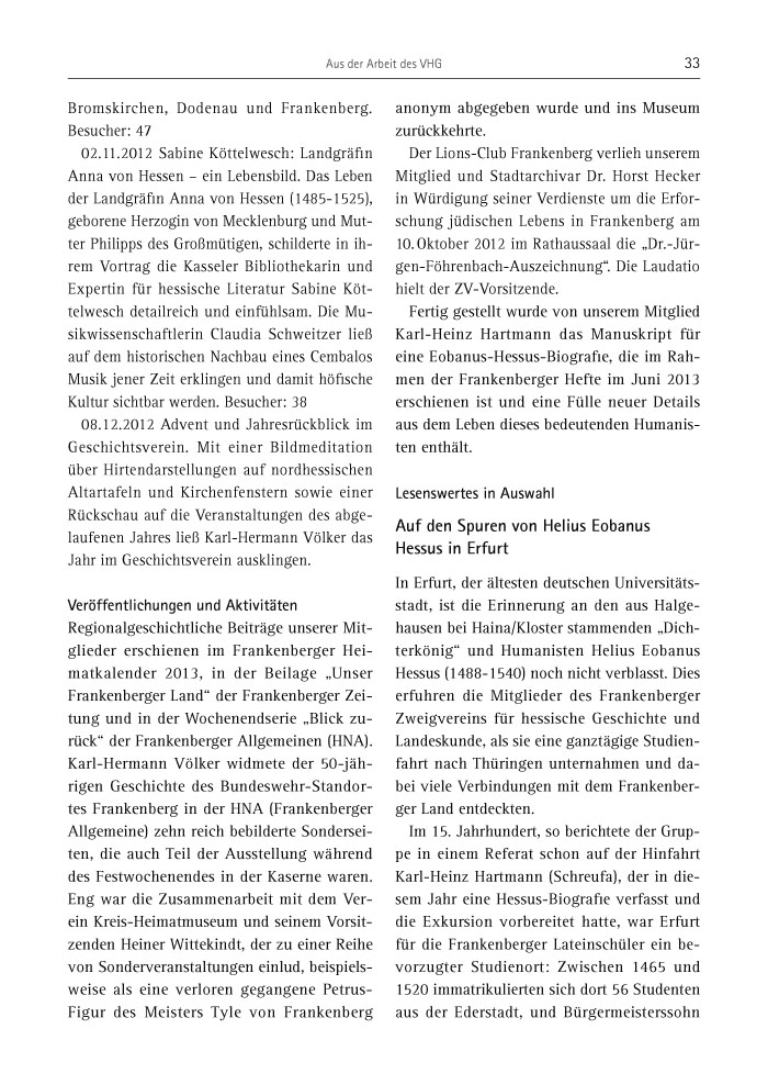 Fertig gestellt wurde von unserem Mitglied Karl-Heinz Hartmann das Manuskript für eine Eobanus-Hessus-Biografie, die im Rahmen der Frankenberger Hefte im Juni 2013 erschienen ist und eine Fülle neuer Details aus dem Leben dieses bedeutenden Humanisten enthält.