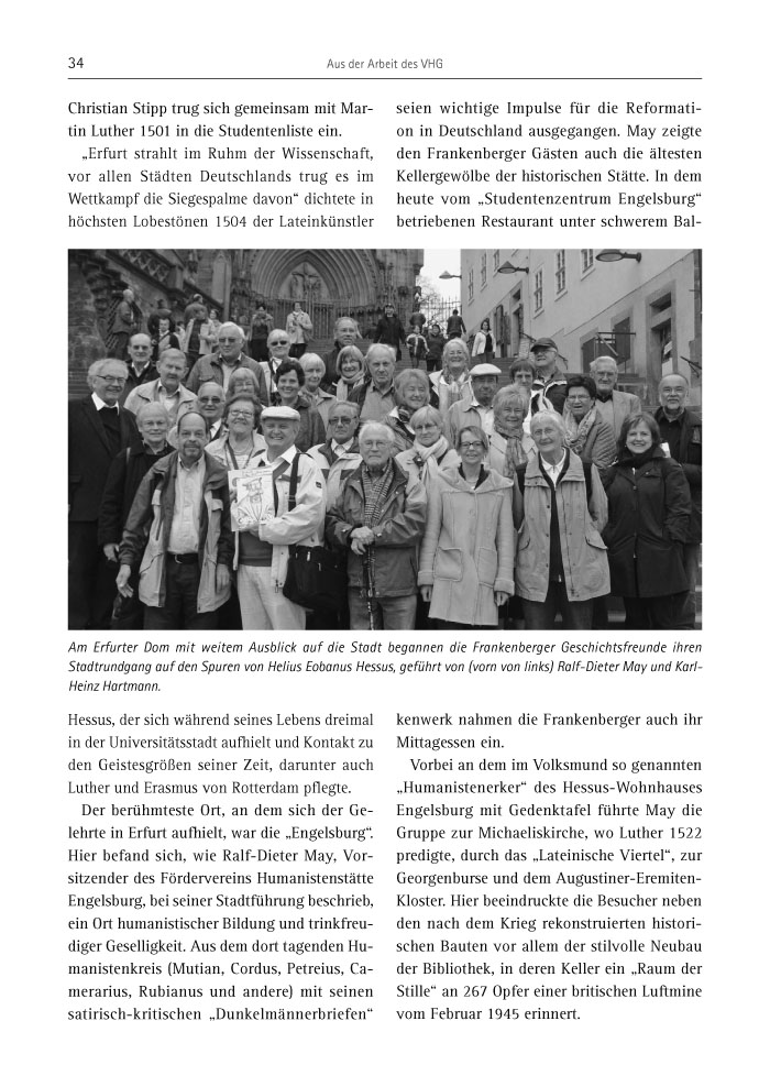 Der berühmteste Ort, an dem sich der Gelehrte in Erfurt aufhielt, war die „Engelsburg“. Hier befand sich, wie Ralf-Dieter May, Vorsitzender des Fördervereins Humanistenstätte Engelsburg, bei seiner Stadtführung beschrieb, ein Ort humanistischer Bildung und trinkfreudiger Geselligkeit. Aus dem dort tagenden Humanistenkreis (Mutian, Cordus, Petreius, Camerarius, Rubianus und andere) mit seinen satirisch-kritischen „Dunkelmännerbriefen“ seien wichtige Impulse für die Reformation in Deutschland ausgegangen. May zeigte den Frankenberger Gästen auch die ältesten Kellergewölbe der historischen Stätte. In dem heute vom „Studentenzentrum Engelsburg“ betriebenen Restaurant unter schwerem Balkenwerk nahmen die Frankenberger auch ihr Mittagessen ein.