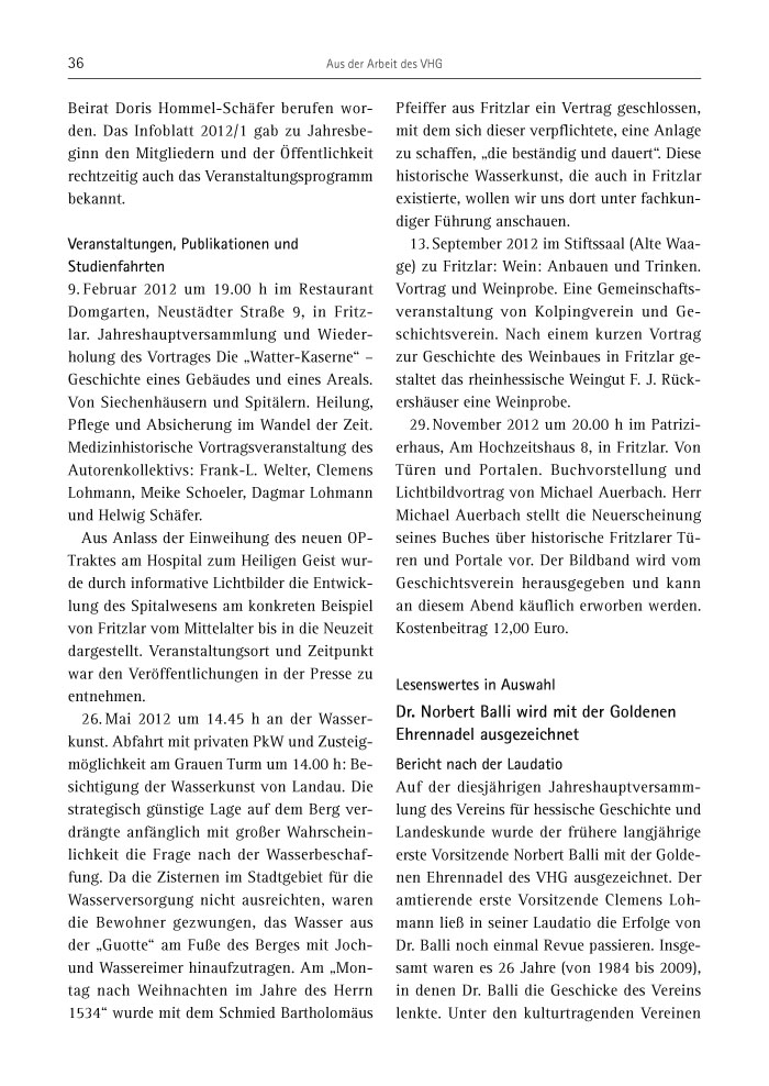 9. Februar 2012 um 19.00 h im Restaurant Domgarten, Neustädter Straße 9, in Fritzlar. Jahreshauptversammlung und Wiederholung des Vortrages Die „Watter-Kaserne“ – Geschichte eines Gebäudes und eines Areals. Von Siechenhäusern und Spitälern. Heilung, Pflege und Absicherung im Wandel der Zeit. Medizinhistorische Vortragsveranstaltung des Autorenkollektivs: Frank-L. Welter, Clemens Lohmann, Meike Schoeler, Dagmar Lohmann und Helwig Schäfer.