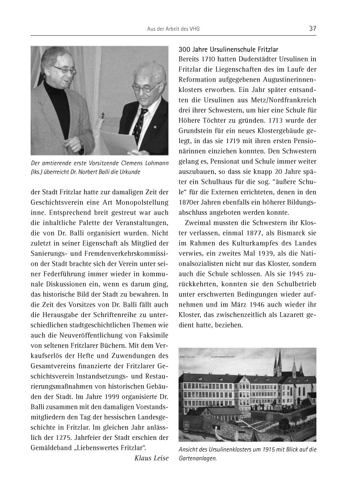 der Stadt Fritzlar hatte zur damaligen Zeit der Geschichtsverein eine Art Monopolstellung inne. Entsprechend breit gestreut war auch die inhaltliche Palette der Veranstaltungen, die von Dr. Balli organisiert wurden. Nicht zuletzt in seiner Eigenschaft als Mitglied der Sanierungs- und Fremdenverkehrskommission der Stadt brachte sich der Verein unter seiner Federführung immer wieder in kommunale Diskussionen ein, wenn es darum ging, das historische Bild der Stadt zu bewahren. In die Zeit des Vorsitzes von Dr. Balli fällt auch die Herausgabe der Schriftenreihe zu unterschiedlichen stadtgeschichtlichen Themen wie auch die Neuveröffentlichung von Faksimile von seltenen Fritzlarer Büchern. Mit dem Verkaufserlös der Hefte und Zuwendungen des Gesamtvereins finanzierte der Fritzlarer Geschichtsverein Instandsetzungs- und Restaurierungsmaßnahmen von historischen Gebäuden der Stadt. Im Jahre 1999 organisierte Dr. Balli zusammen mit den damaligen Vorstandsmitgliedern den Tag der hessischen Landesgeschichte in Fritzlar. Im gleichen Jahr anlässlich der 1275. Jahrfeier der Stadt erschien der Gemäldeband „Liebenswertes Fritzlar“.