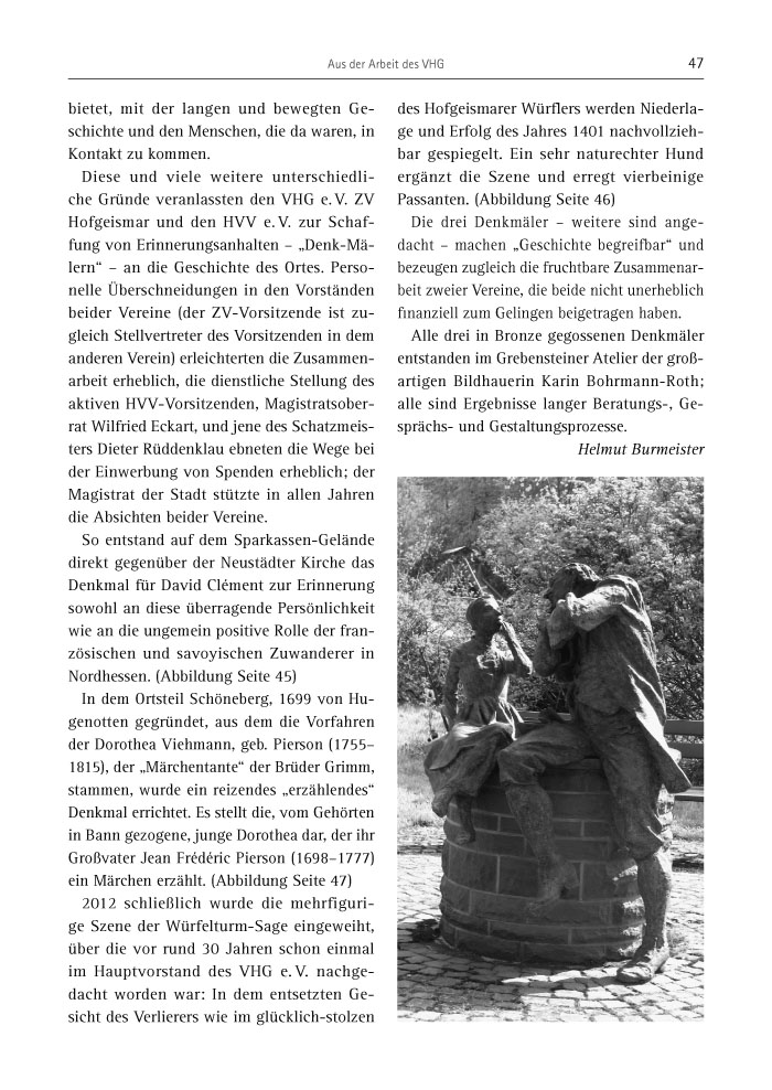 So entstand auf dem Sparkassen-Gelände direkt gegenüber der Neustädter Kirche das Denkmal für David Clément zur Erinnerung sowohl an diese überragende Persönlichkeit wie an die ungemein positive Rolle der französischen und savoyischen Zuwanderer in Nordhessen. (Abbildung Seite 45)