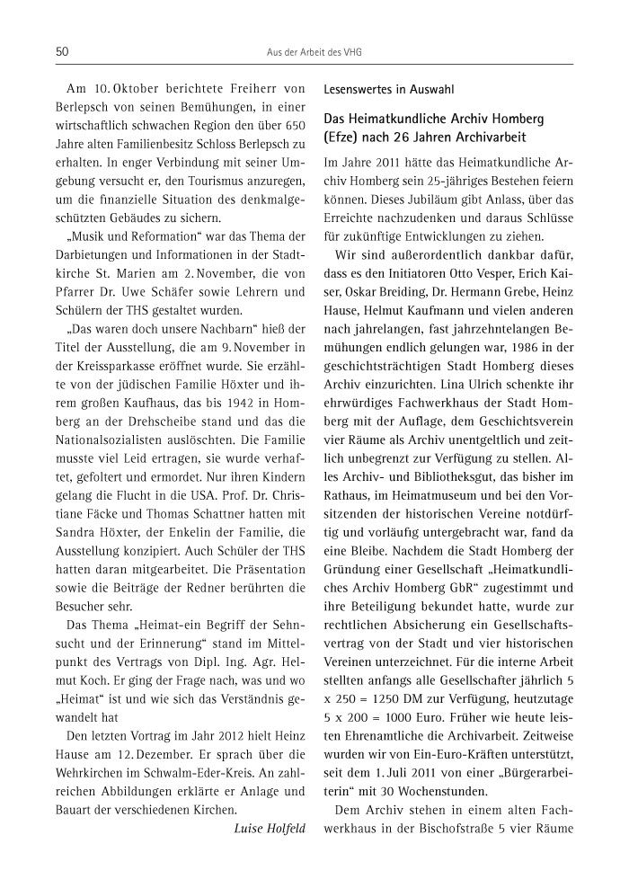 Im Jahre 2011 hätte das Heimatkundliche Archiv Homberg sein 25-jähriges Bestehen feiern können. Dieses Jubiläum gibt Anlass, über das Erreichte nachzudenken und daraus Schlüsse für zukünftige Entwicklungen zu ziehen.