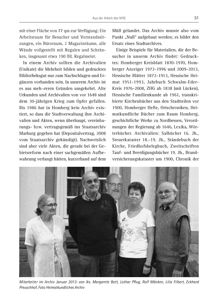 Einige Beispiele für Materialien, die der Besucher in unserm Archiv findet: Gedrucktes: Homberger Kreisblatt 1870-1970, Homberger Anzeiger 1972-1996 und 2009-2013, Hessische Blätter 1872-1913, Hessische Heimat 1951-1993, Jahrbuch Schwalm-Eder-Kreis 1976-2008, ZHG ab 1838 (mit Lücken), Hessische Familienkunde ab 1961, transkribierte Kirchenbücher aus den Stadtteilen vor 1900, Homberger Hefte, Ortschroniken, Heimatkundliche Bücher zum Raum Homberg, geschichtliche Werke zu Nordhessen, Verordnungen der Regierung ab 1646, Lexika, Wörterbücher. Archivalien: Salbücher 16. Jh., Steuerkataster 18.-19. Jh., Ständebuch der Kirche, Friedhofsbelegbuch, Zweitschriften Tauf- und Beerdigungsbücher 19. Jh., Brandversicherungskataster um 1900, Chronik der
