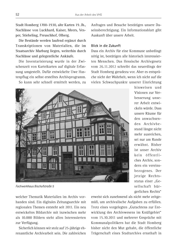 Dass ein Archiv für eine Kommune unbedingt nötig ist, bestätigen alle historisch interessierten Menschen. Das Hessische Archivgesetz vom 26.11.2012 schreibt das neuerdings der Stadt Homberg geradezu vor. Aber es entspräche nicht der Wahrheit, wenn ich nicht auf die vielen Schwachpunkte unserer Einrichtung hinweisen und Visionen zur Verbesserung unserer Arbeit entwickeln würde. Dass unsere Räume für den anwachsenden Archivbestand längst nicht mehr ausreichen, sei nur am Rande erwähnt. Bisher ist unser Archiv kein öffentliches Archiv, sondern ein vereinsbezogenes. Der jetzige Rechtsstatus einer „Gesellschaft bürgerlichen Rechts“ erweist sich zunehmend als nicht mehr zeitgemäß, um archivalische Aufgaben zu erfüllen. Trotz eines vorgelegten „Gutachtens zur Entwicklung des Archivwesens im Knüllgebiet“ vom 15.10.2011 und mehrerer Gespräche mit Kommunalpolitikern hat die Stadt Homberg bisher nicht den Mut gehabt, die öffentliche Trägerschaft eines Stadtarchivs ernsthaft in