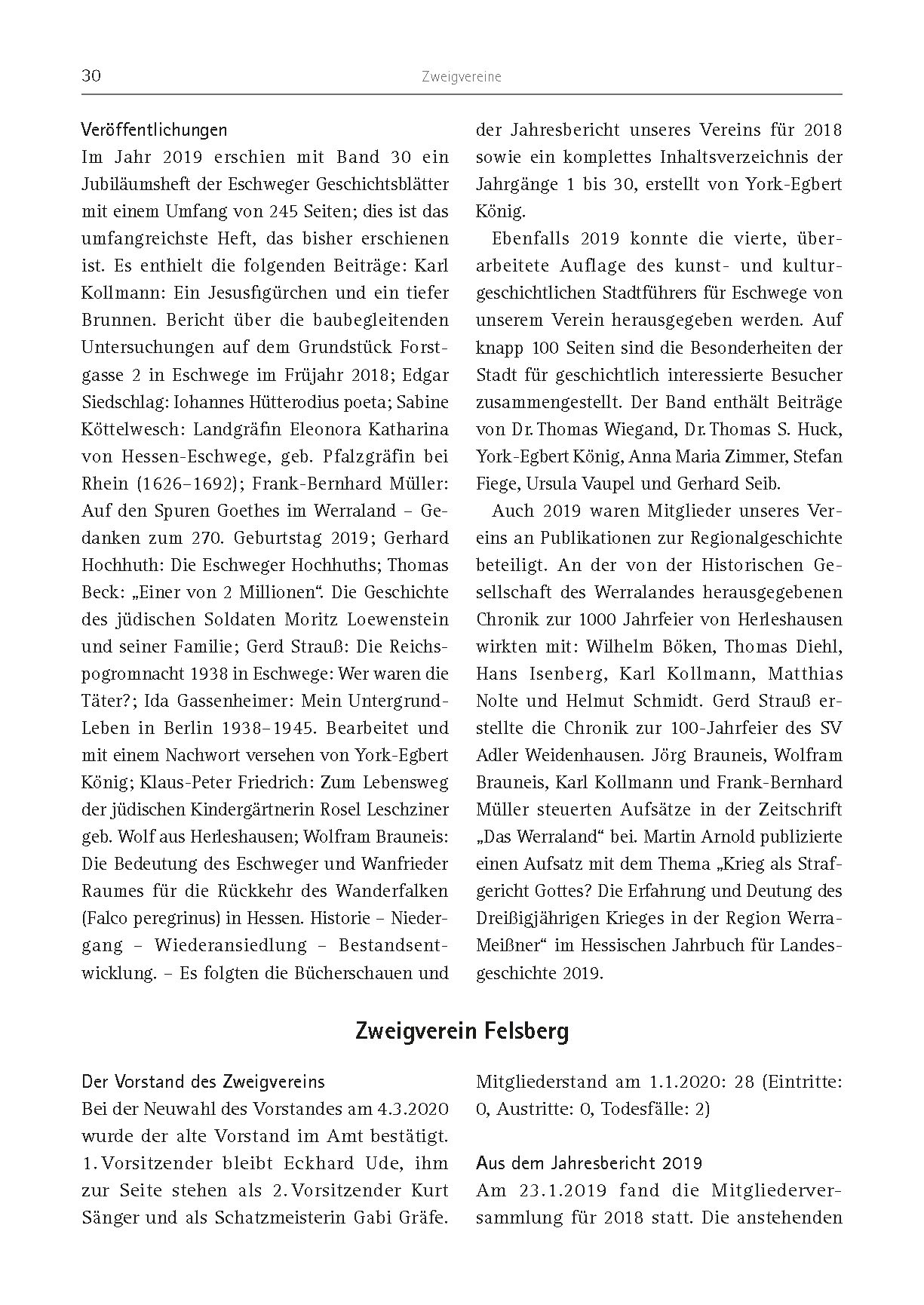 30 Zweigvereine Veröffentlichungen Im Jahr 2019 erschien mit Band 30 ein Jubiläumsheft der Eschweger Geschichtsblätter mit einem Umfang von 245 Seiten; dies ist das umfangreichste Heft, das bisher erschienen ist. Es enthielt die folgenden Beiträge: Karl Kollmann: Ein Jesusfigürchen und ein tiefer Brunnen. Bericht über die baubegleitenden Untersuchungen auf dem Grundstück Forstgasse 2 in Eschwege im Früjahr 2018; Edgar Siedschlag: Iohannes Hütterodius poeta; Sabine Köttelwesch: Landgräfin Eleonora Katharina von Hessen-Eschwege, geb. Pfalzgräfin bei Rhein (1626–1692); Frank-Bernhard Müller: Auf den Spuren Goethes im Werraland – Gedanken zum 270. Geburtstag 2019; Gerhard Hochhuth: Die Eschweger Hochhuths; Thomas Beck: „Einer von 2 Millionen“. Die Geschichte des jüdischen Soldaten Moritz Loewenstein und seiner Familie; Gerd Strauß: Die Reichspogromnacht 1938 in Eschwege: Wer waren die Täter?; Ida Gassenheimer: Mein Untergrund- Leben in Berlin 1938–1945. Bearbeitet und mit einem Nachwort versehen von York-Egbert König; Klaus-Peter Friedrich: Zum Lebensweg der jüdischen Kindergärtnerin Rosel Leschziner geb. Wolf aus Herleshausen; Wolfram Brauneis: Die Bedeutung des Eschweger und Wanfrieder Raumes für die Rückkehr des Wanderfalken (Falco peregrinus) in Hessen. Historie – Niedergang – Wiederansiedlung – Bestandsentwicklung. – Es folgten die Bücherschauen und der Jahresbericht unseres Vereins für 2018 sowie ein komplettes Inhaltsverzeichnis der Jahrgänge 1 bis 30, erstellt von York-Egbert König. Ebenfalls 2019 konnte die vierte, überarbeitete Auflage des kunst- und kulturgeschichtlichen Stadtführers für Eschwege von unserem Verein herausgegeben werden. Auf knapp 100 Seiten sind die Besonderheiten der Stadt für geschichtlich interessierte Besucher zusammengestellt. Der Band enthält Beiträge von Dr. Thomas Wiegand, Dr. Thomas S. Huck, York-Egbert König, Anna Maria Zimmer, Stefan Fiege, Ursula Vaupel und Gerhard Seib. Auch 2019 waren Mitglieder unseres Vereins an Publikationen zur Regionalgeschichte beteiligt. An der von der Historischen Gesellschaft des Werralandes herausgegebenen Chronik zur 1000 Jahrfeier von Herleshausen wirkten mit: Wilhelm Böken, Thomas Diehl, Hans Isenberg, Karl Kollmann, Matthias Nolte und Helmut Schmidt. Gerd Strauß erstellte die Chronik zur 100-Jahrfeier des SV Adler Weidenhausen. Jörg Brauneis, Wolfram Brauneis, Karl Kollmann und Frank-Bernhard Müller steuerten Aufsätze in der Zeitschrift „Das Werraland“ bei. Martin Arnold publizierte einen Aufsatz mit dem Thema „Krieg als Strafgericht Gottes? Die Erfahrung und Deutung des Dreißigjährigen Krieges in der Region Werra- Meißner“ im Hessischen Jahrbuch für Landesgeschichte 2019. Der Vorstand des Zweigvereins Bei der Neuwahl des Vorstandes am 4.3.2020 wurde der alte Vorstand im Amt bestätigt. 1. Vorsitzender bleibt Eckhard Ude, ihm zur Seite stehen als 2. Vorsitzender Kurt Sänger und als Schatzmeisterin Gabi Gräfe. Mitgliederstand am 1.1.2020: 28 (Eintritte: 0, Austritte: 0, Todesfälle: 2) Aus dem Jahresbericht 2019 Am 23.1.2019 fand die Mitgliederversammlung für 2018 statt. Die anstehenden Zweigverein Felsberg