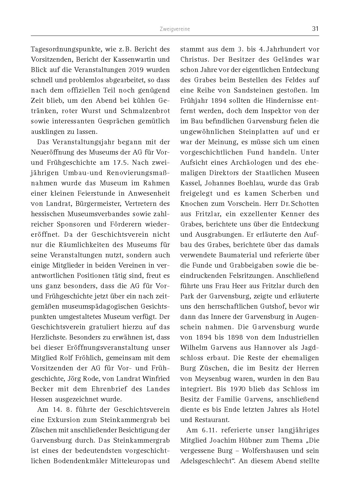 Zweigvereine 31 Tagesordnungspunkte, wie z. B. Bericht des Vorsitzenden, Bericht der Kassenwartin und Blick auf die Veranstaltungen 2019 wurden schnell und problemlos abgearbeitet, so dass nach dem offiziellen Teil noch genügend Zeit blieb, um den Abend bei kühlen Getränken, roter Wurst und Schmalzenbrot sowie interessanten Gesprächen gemütlich ausklingen zu lassen. Das Veranstaltungsjahr begann mit der Neueröffnung des Museums der AG für Vorund Frühgeschichte am 17.5. Nach zweijährigen Umbau-und Renovierungsmaßnahmen wurde das Museum im Rahmen einer kleinen Feierstunde in Anwesenheit von Landrat, Bürgermeister, Vertretern des hessischen Museumsverbandes sowie zahlreicher Sponsoren und Förderern wiedereröffnet. Da der Geschichtsverein nicht nur die Räumlichkeiten des Museums für seine Veranstaltungen nutzt, sondern auch einige Mitglieder in beiden Vereinen in verantwortlichen Positionen tätig sind, freut es uns ganz besonders, dass die AG für Vorund Frühgeschichte jetzt über ein nach zeitgemäßen museumspädagogischen Gesichtspunkten umgestaltetes Museum verfügt. Der Geschichtsverein gratuliert hierzu auf das Herzlichste. Besonders zu erwähnen ist, dass bei dieser Eröffnungsveranstaltung unser Mitglied Rolf Fröhlich, gemeinsam mit dem Vorsitzenden der AG für Vor- und Frühgeschichte, Jörg Rode, von Landrat Winfried Becker mit dem Ehrenbrief des Landes Hessen ausgezeichnet wurde. Am 14. 8. führte der Geschichtsverein eine Exkursion zum Steinkammergrab bei Züschen mit anschließender Besichtigung der Garvensburg durch. Das Steinkammergrab ist eines der bedeutendsten vorgeschichtlichen Bodendenkmäler Mitteleuropas und stammt aus dem 3. bis 4. Jahrhundert vor Christus. Der Besitzer des Geländes war schon Jahre vor der eigentlichen Entdeckung des Grabes beim Bestellen des Feldes auf eine Reihe von Sandsteinen gestoßen. Im Frühjahr 1894 sollten die Hindernisse entfernt werden, doch dem Inspektor von der im Bau befindlichen Garvensburg fielen die ungewöhnlichen Steinplatten auf und er war der Meinung, es müsse sich um einen vorgeschichtlichen Fund handeln. Unter Aufsicht eines Archäologen und des ehemaligen Direktors der Staatlichen Museen Kassel, Johannes Boehlau, wurde das Grab freigelegt und es kamen Scherben und Knochen zum Vorschein. Herr Dr. Schotten aus Fritzlar, ein exzellenter Kenner des Grabes, berichtete uns über die Entdeckung und Ausgrabungen. Er erläuterte den Aufbau des Grabes, berichtete über das damals verwendete Baumaterial und referierte über die Funde und Grabbeigaben sowie die beeindruckenden Felsritzungen. Anschließend führte uns Frau Heer aus Fritzlar durch den Park der Garvensburg, zeigte und erläuterte uns den herrschaftlichen Gutshof, bevor wir dann das Innere der Garvensburg in Augenschein nahmen. Die Garvensburg wurde von 1894 bis 1898 von dem Industriellen Wilhelm Garvens aus Hannover als Jagdschloss erbaut. Die Reste der ehemaligen Burg Züschen, die im Besitz der Herren von Meysenbug waren, wurden in den Bau integriert. Bis 1970 blieb das Schloss im Besitz der Familie Garvens, anschließend diente es bis Ende letzten Jahres als Hotel und Restaurant. Am 6.11. referierte unser langjähriges Mitglied Joachim Hübner zum Thema „Die vergessene Burg – Wolfershausen und sein Adelsgeschlecht“. An diesem Abend stellte