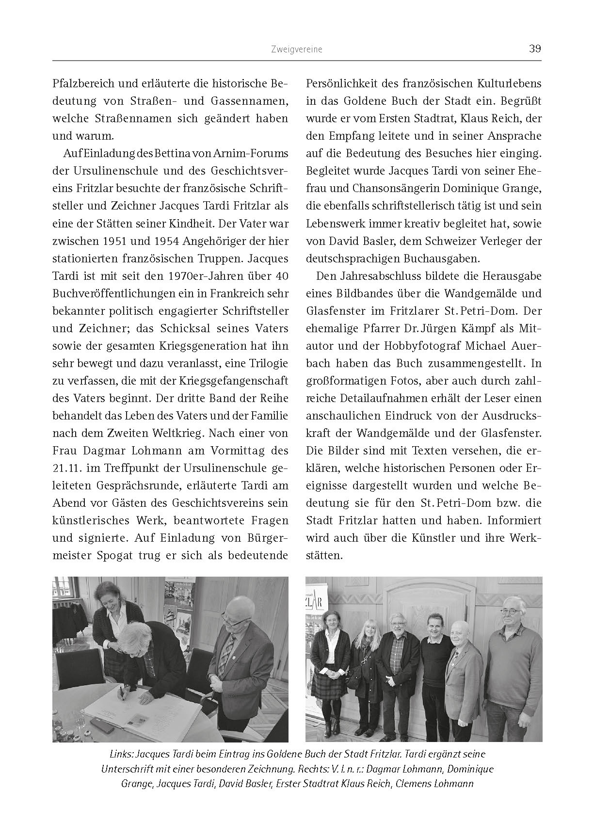 Zweigvereine 39 Pfalzbereich und erläuterte die historische Bedeutung von Straßen- und Gassennamen, welche Straßennamen sich geändert haben und warum. Auf Einladung des Bettina von Arnim-Forums der Ursulinenschule und des Geschichtsvereins Fritzlar besuchte der französische Schriftsteller und Zeichner Jacques Tardi Fritzlar als eine der Stätten seiner Kindheit. Der Vater war zwischen 1951 und 1954 Angehöriger der hier stationierten französischen Truppen. Jacques Tardi ist mit seit den 1970er-Jahren über 40 Buchveröffentlichungen ein in Frankreich sehr bekannter politisch engagierter Schriftsteller und Zeichner; das Schicksal seines Vaters sowie der gesamten Kriegsgeneration hat ihn sehr bewegt und dazu veranlasst, eine Trilogie zu verfassen, die mit der Kriegsgefangenschaft des Vaters beginnt. Der dritte Band der Reihe behandelt das Leben des Vaters und der Familie nach dem Zweiten Weltkrieg. Nach einer von Frau Dagmar Lohmann am Vormittag des 21.11. im Treffpunkt der Ursulinenschule geleiteten Gesprächsrunde, erläuterte Tardi am Abend vor Gästen des Geschichtsvereins sein künstlerisches Werk, beantwortete Fragen und signierte. Auf Einladung von Bürgermeister Spogat trug er sich als bedeutende Persönlichkeit des französischen Kulturlebens in das Goldene Buch der Stadt ein. Begrüßt wurde er vom Ersten Stadtrat, Klaus Reich, der den Empfang leitete und in seiner Ansprache auf die Bedeutung des Besuches hier einging. Begleitet wurde Jacques Tardi von seiner Ehefrau und Chansonsängerin Dominique Grange, die ebenfalls schriftstellerisch tätig ist und sein Lebenswerk immer kreativ begleitet hat, sowie von David Basler, dem Schweizer Verleger der deutschsprachigen Buchausgaben. Den Jahresabschluss bildete die Herausgabe eines Bildbandes über die Wandgemälde und Glasfenster im Fritzlarer St. Petri-Dom. Der ehemalige Pfarrer Dr. Jürgen Kämpf als Mitautor und der Hobbyfotograf Michael Auerbach haben das Buch zusammengestellt. In großformatigen Fotos, aber auch durch zahlreiche Detailaufnahmen erhält der Leser einen anschaulichen Eindruck von der Ausdruckskraft der Wandgemälde und der Glasfenster. Die Bilder sind mit Texten versehen, die erklären, welche historischen Personen oder Ereignisse dargestellt wurden und welche Bedeutung sie für den St. Petri-Dom bzw. die Stadt Fritzlar hatten und haben. Informiert wird auch über die Künstler und ihre Werkstätten. Links: Jacques Tardi beim Eintrag ins Goldene Buch der Stadt Fritzlar. Tardi ergänzt seine Unterschrift mit einer besonderen Zeichnung. Rechts: V. l. n. r.: Dagmar Lohmann, Dominique Grange, Jacques Tardi, David Basler, Erster Stadtrat Klaus Reich, Clemens Lohmann
