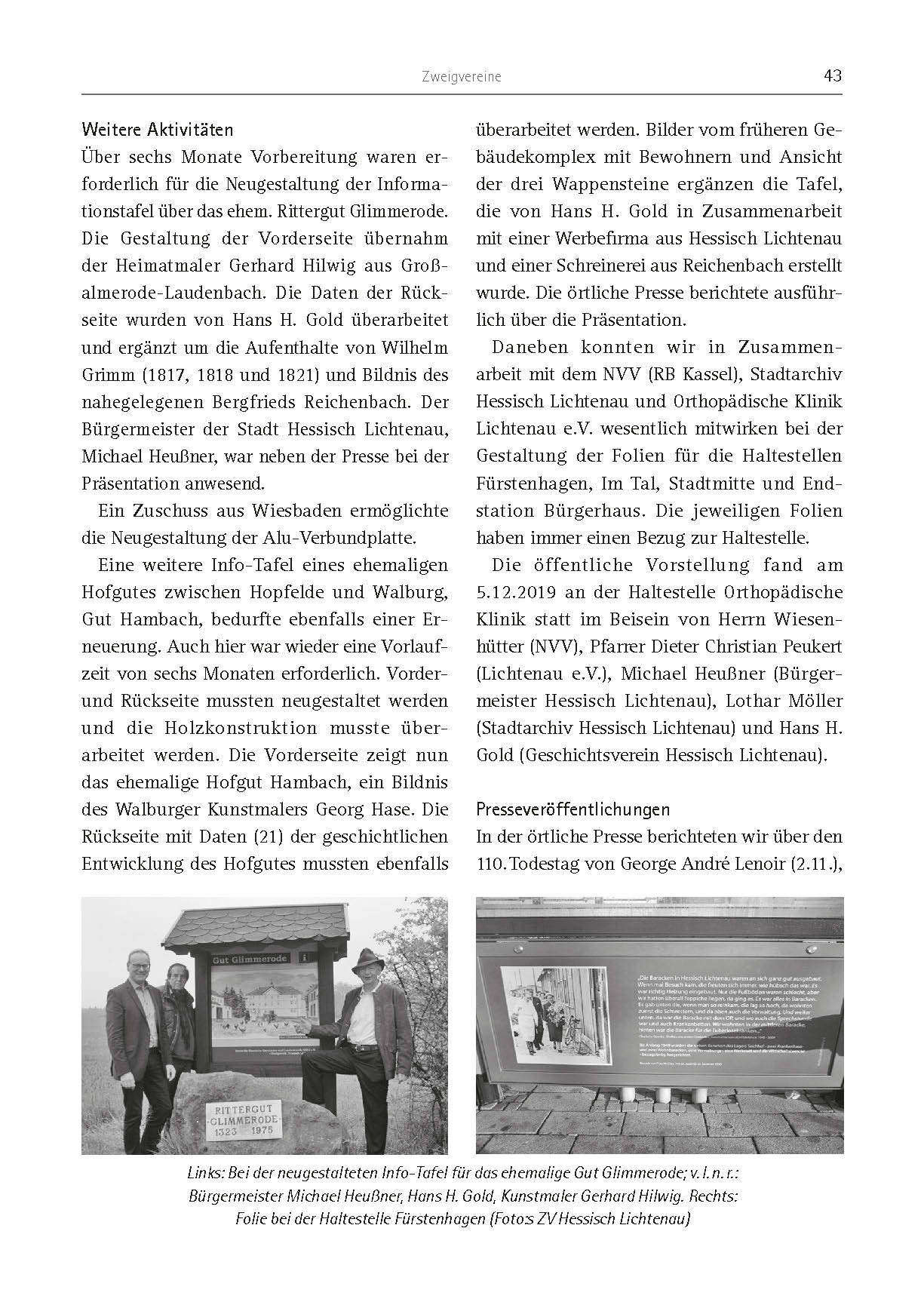 Zweigvereine 43 Weitere Aktivitäten Über sechs Monate Vorbereitung waren erforderlich für die Neugestaltung der Informationstafel über das ehem. Rittergut Glimmerode. Die Gestaltung der Vorderseite übernahm der Heimatmaler Gerhard Hilwig aus Großalmerode- Laudenbach. Die Daten der Rückseite wurden von Hans H. Gold überarbeitet und ergänzt um die Aufenthalte von Wilhelm Grimm (1817, 1818 und 1821) und Bildnis des nahegelegenen Bergfrieds Reichenbach. Der Bürgermeister der Stadt Hessisch Lichtenau, Michael Heußner, war neben der Presse bei der Präsentation anwesend. Ein Zuschuss aus Wiesbaden ermöglichte die Neugestaltung der Alu-Verbundplatte. Eine weitere Info-Tafel eines ehemaligen Hofgutes zwischen Hopfelde und Walburg, Gut Hambach, bedurfte ebenfalls einer Erneuerung. Auch hier war wieder eine Vorlaufzeit von sechs Monaten erforderlich. Vorderund Rückseite mussten neugestaltet werden und die Holzkonstruktion musste überarbeitet werden. Die Vorderseite zeigt nun das ehemalige Hofgut Hambach, ein Bildnis des Walburger Kunstmalers Georg Hase. Die Rückseite mit Daten (21) der geschichtlichen Entwicklung des Hofgutes mussten ebenfalls überarbeitet werden. Bilder vom früheren Gebäudekomplex mit Bewohnern und Ansicht der drei Wappensteine ergänzen die Tafel, die von Hans H. Gold in Zusammenarbeit mit einer Werbefirma aus Hessisch Lichtenau und einer Schreinerei aus Reichenbach erstellt wurde. Die örtliche Presse berichtete ausführlich über die Präsentation. Daneben konnten wir in Zusammenarbeit mit dem NVV (RB Kassel), Stadtarchiv Hessisch Lichtenau und Orthopädische Klinik Lichtenau e.V. wesentlich mitwirken bei der Gestaltung der Folien für die Haltestellen Fürstenhagen, Im Tal, Stadtmitte und Endstation Bürgerhaus. Die jeweiligen Folien haben immer einen Bezug zur Haltestelle. Die öffentliche Vorstellung fand am 5.12.2019 an der Haltestelle Orthopädische Klinik statt im Beisein von Herrn Wiesenhütter (NVV), Pfarrer Dieter Christian Peukert (Lichtenau e.V.), Michael Heußner (Bürgermeister Hessisch Lichtenau), Lothar Möller (Stadtarchiv Hessisch Lichtenau) und Hans H. Gold (Geschichtsverein Hessisch Lichtenau). Presseveröffentlichungen In der örtliche Presse berichteten wir über den 110. Todestag von George André Lenoir (2.11.), Links: Bei der neugestalteten Info-Tafel für das ehemalige Gut Glimmerode; v. l. n. r.: Bürgermeister Michael Heußner, Hans H. Gold, Kunstmaler Gerhard Hilwig. Rechts: Folie bei der Haltestelle Fürstenhagen (Foto:s ZV Hessisch Lichtenau)