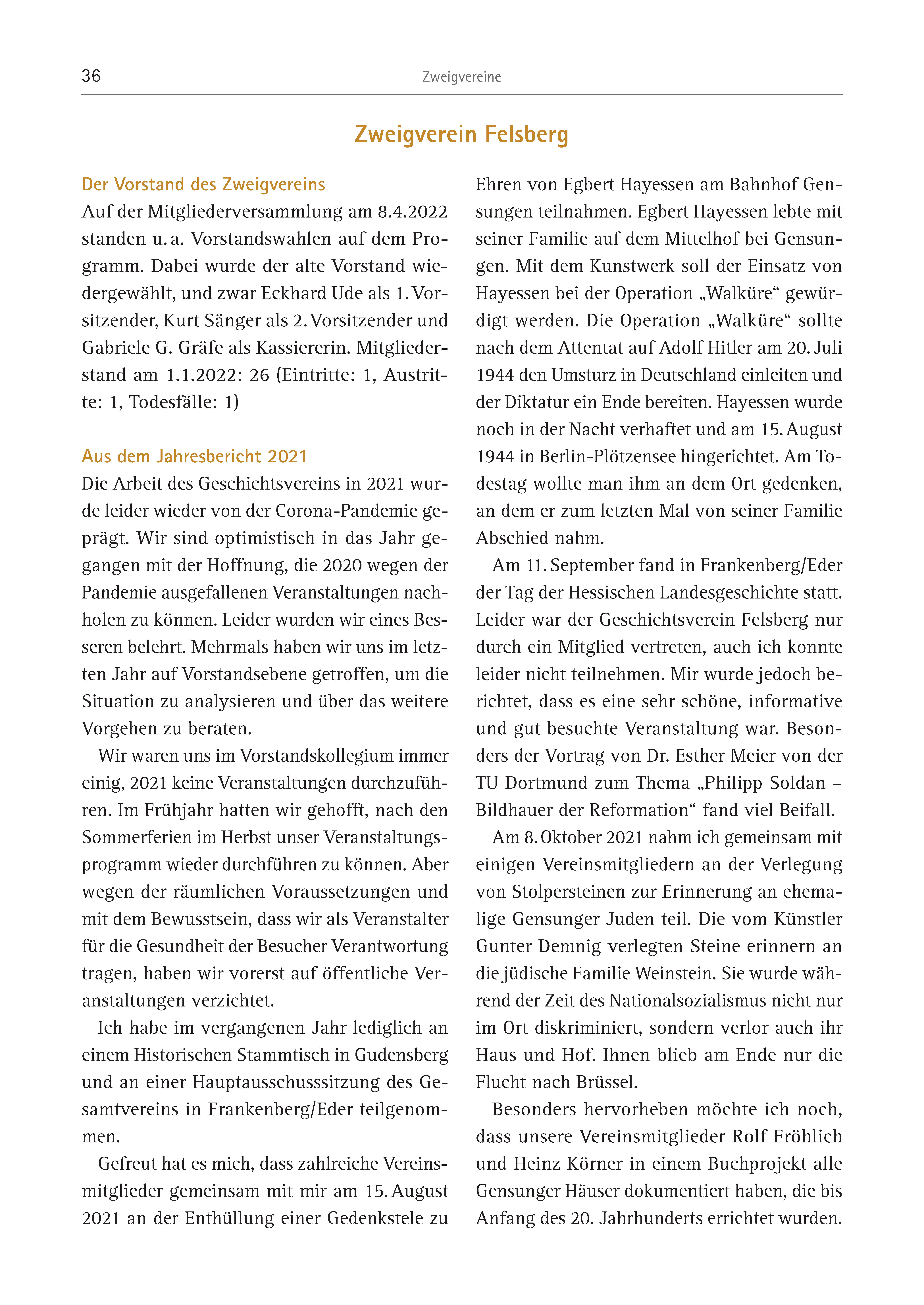 36 Zweigvereine Der Vorstand des Zweigvereins Auf der Mitgliederversammlung am 8.4.2022 standen u. a. Vorstandswahlen auf dem Programm. Dabei wurde der alte Vorstand wiedergewählt, und zwar Eckhard Ude als 1. Vorsitzender, Kurt Sänger als 2. Vorsitzender und Gabriele G. Gräfe als Kassiererin. Mitgliederstand am 1.1.2022: 26 (Eintritte: 1, Austritte: 1, Todesfälle: 1) Aus dem Jahresbericht 2021 Die Arbeit des Geschichtsvereins in 2021 wurde leider wieder von der Corona-Pandemie geprägt. Wir sind optimistisch in das Jahr gegangen mit der Hoffnung, die 2020 wegen der Pandemie ausgefallenen Veranstaltungen nachholen zu können. Leider wurden wir eines Besseren belehrt. Mehrmals haben wir uns im letzten Jahr auf Vorstandsebene getroffen, um die Situation zu analysieren und über das weitere Vorgehen zu beraten. Wir waren uns im Vorstandskollegium immer einig, 2021 keine Veranstaltungen durchzuführen. Im Frühjahr hatten wir gehofft, nach den Sommerferien im Herbst unser Veranstaltungsprogramm wieder durchführen zu können. Aber wegen der räumlichen Voraussetzungen und mit dem Bewusstsein, dass wir als Veranstalter für die Gesundheit der Besucher Verantwortung tragen, haben wir vorerst auf öffentliche Veranstaltungen verzichtet. Ich habe im vergangenen Jahr lediglich an einem Historischen Stammtisch in Gudensberg und an einer Hauptausschusssitzung des Gesamtvereins in Frankenberg/Eder teilgenommen. Gefreut hat es mich, dass zahlreiche Vereinsmitglieder gemeinsam mit mir am 15. August 2021 an der Enthüllung einer Gedenkstele zu Ehren von Egbert Hayessen am Bahnhof Gensungen teilnahmen. Egbert Hayessen lebte mit seiner Familie auf dem Mittelhof bei Gensungen. Mit dem Kunstwerk soll der Einsatz von Hayessen bei der Operation „Walküre“ gewürdigt werden. Die Operation „Walküre“ sollte nach dem Attentat auf Adolf Hitler am 20. Juli 1944 den Umsturz in Deutschland einleiten und der Diktatur ein Ende bereiten. Hayessen wurde noch in der Nacht verhaftet und am 15. August 1944 in Berlin-Plötzensee hingerichtet. Am Todestag wollte man ihm an dem Ort gedenken, an dem er zum letzten Mal von seiner Familie Abschied nahm. Am 11. September fand in Frankenberg/Eder der Tag der Hessischen Landesgeschichte statt. Leider war der Geschichtsverein Felsberg nur durch ein Mitglied vertreten, auch ich konnte leider nicht teilnehmen. Mir wurde jedoch berichtet, dass es eine sehr schöne, informative und gut besuchte Veranstaltung war. Besonders der Vortrag von Dr. Esther Meier von der TU Dortmund zum Thema „Philipp Soldan – Bildhauer der Reformation“ fand viel Beifall. Am 8. Oktober 2021 nahm ich gemeinsam mit einigen Vereinsmitgliedern an der Verlegung von Stolpersteinen zur Erinnerung an ehemalige Gensunger Juden teil. Die vom Künstler Gunter Demnig verlegten Steine erinnern an die jüdische Familie Weinstein. Sie wurde während der Zeit des Nationalsozialismus nicht nur im Ort diskriminiert, sondern verlor auch ihr Haus und Hof. Ihnen blieb am Ende nur die Flucht nach Brüssel. Besonders hervorheben möchte ich noch, dass unsere Vereinsmitglieder Rolf Fröhlich und Heinz Körner in einem Buchprojekt alle Gensunger Häuser dokumentiert haben, die bis Anfang des 20. Jahrhunderts errichtet wurden. Zweigverein Felsberg