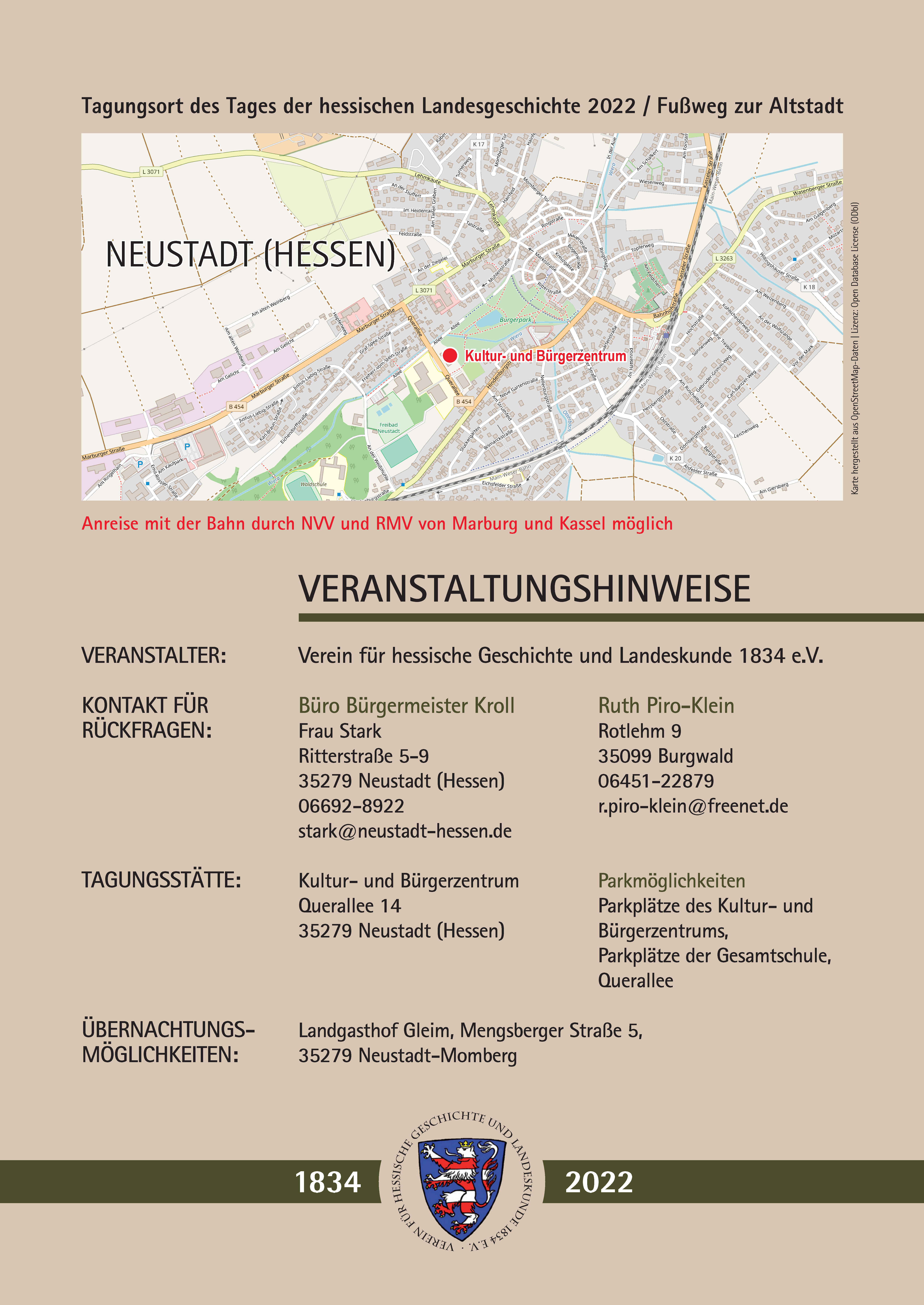 40 Zweigvereine VEREIN FÜR HESSISCHE GESCHICHTE UND LANDESKUNDE 1834 E.V. · VERANSTALTUNGSHINWEISE Tagungsort des Tages der hessischen Landesgeschichte 2022 / Fußweg zur Altstadt Anreise mit der Bahn durch NVV und RMV von Marburg und Kassel möglich VERANSTALTER: Verein für hessische Geschichte und Landeskunde 1834 e.V. KONTAKT FÜR Büro Bürgermeister Kroll Ruth Piro-Klein RÜCKFRAGEN: Frau Stark Rotlehm 9 Ritterstraße 5-9 35099 Burgwald 35279 Neustadt (Hessen) 06451-22879 06692-8922 r.piro-klein@freenet.de stark@neustadt-hessen.de TAGUNGSSTÄTTE: Kultur- und Bürgerzentrum Parkmöglichkeiten Querallee 14 Parkplätze des Kultur- und 35279 Neustadt (Hessen) Bürgerzentrums, Parkplätze der Gesamtschule, Querallee ÜBERNACHTUNGS- Landgasthof Gleim, Mengsberger Straße 5, MÖGLICHKEITEN: 35279 Neustadt-Momberg 1834 2022 B 454 B 454 B 454 L 3071 L 3071 L 3071 L 3263 K 17 K 18 K 20 Marburger Straße Marburger Straße Marburger Straße Hindenburgstraße Kasseler Straße KasselerStraße Kass ele rStraße Bahnhofstraße Querallee Querallee GleimenhainerStraße Wasenberger Straße Marburger Straße Lehmkaute Lehmkaute Willingshäuser Straße Alsfelder Straße Alsfelder Straße Freiherr-vom-Stein-Straße Straße Justus-Liebig-Straße Justus-Liebig-Straße Königsberger Straße Emil-Rössler-Straße Gebrüder-Grimm-Weg Eichsfelder Straße Neue Gartenstraße Neue Gartenstraße Karl-Braun-Straße Eichendorffstraße An der Wolfszange Am alten Weinberg Am altenWeinberg Thüringer Straße Nellenburgstraße Leipziger Straße Hindenburgstraße Graf-Spee-Straße Dresdener Straße Carl-Bantzer-Weg An der Weißmühle Am Tiefen Graben Kohlscheiderweg Erfurter Straße Beethovenstraße An der Ziegelei An der Stuffert Herzbergstraße Dörnbergstraße Bismarckstraße Am Struthteich Am Struthteich Am Ruschelberg Sudetenstraße Stückergärten Rabenaustraße Rabenaustraße Momberger Tor Momberger Tor Am Weizenberg Am Struthfeld Am Ringelhain Am Galgenberg Vor der Mark Ritterstraße Mühlenstraße Mozartstraße Im Heidental ImHa ett n dor Händelstraß Am Schalkert Am Schalkert Am Giersberg Mauerstraße Marktstraße Hohe Treppe Bogenstraße Am Kaufpark AmForstamt Struthring Ringstraße Ringstraße Lerchenweg Kreuzgasse In der Aue H Hochstraße Feldstraße Bergstraße Am Gelicht Am Gelicht Wiesenweg Turnerweg Töpferweg Talstraße Sonnenweg Oststraße Hopfenweg Ha Hainfeld Hainfeld Bahnhaus Allee Allee Allee Am Feldchen Main-Weser-Bahn Main-Weser-Bahn Main-Weser-Bahn Main-Weser-Bahn Bürgerpark Waldschule Freibad Neustadt Wiera Otterbach Wiera Wiera Neustadt Momberg NEUSTADT (HESSEN) Karte hergestellt aus OpenStreetMapDaten | Lizenz: Open Database License (ODbl) Kultur- und Bürgerzentrum