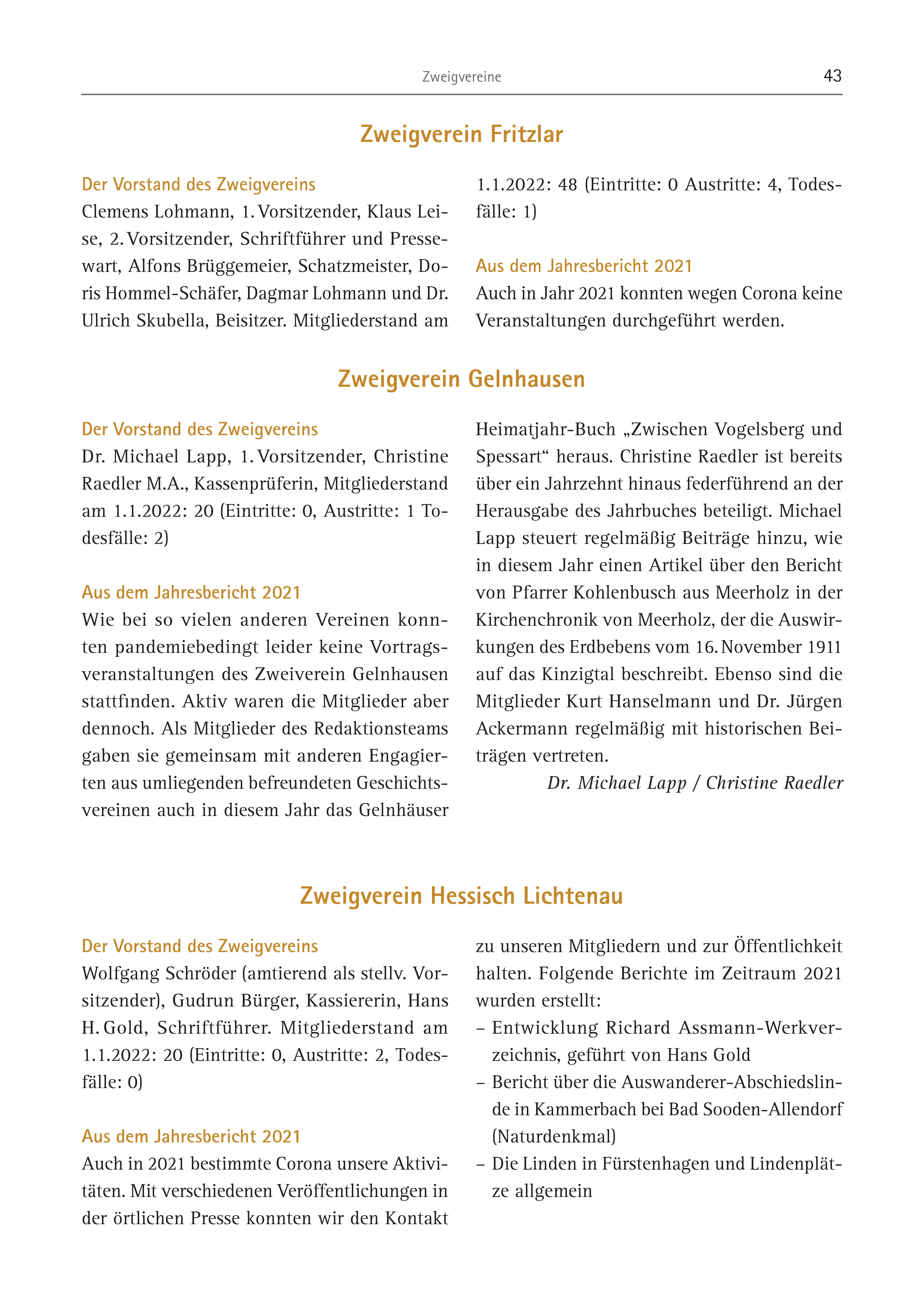 Zweigvereine 43 Der Vorstand des Zweigvereins Clemens Lohmann, 1. Vorsitzender, Klaus Leise, 2. Vorsitzender, Schriftführer und Pressewart, Alfons Brüggemeier, Schatzmeister, Doris Hommel-Schäfer, Dagmar Lohmann und Dr. Ulrich Skubella, Beisitzer. Mitgliederstand am Zweigverein Fritzlar 1.1.2022: 48 (Eintritte: 0 Austritte: 4, Todesfälle: 1) Aus dem Jahresbericht 2021 Auch in Jahr 2021 konnten wegen Corona keine Veranstaltungen durchgeführt werden. Der Vorstand des Zweigvereins Dr. Michael Lapp, 1. Vorsitzender, Christine Raedler M.A., Kassenprüferin, Mitgliederstand am 1.1.2022: 20 (Eintritte: 0, Austritte: 1 Todesfälle: 2) Aus dem Jahresbericht 2021 Wie bei so vielen anderen Vereinen konnten pandemiebedingt leider keine Vortragsveranstaltungen des Zweiverein Gelnhausen stattfinden. Aktiv waren die Mitglieder aber dennoch. Als Mitglieder des Redaktionsteams gaben sie gemeinsam mit anderen Engagierten aus umliegenden befreundeten Geschichtsvereinen auch in diesem Jahr das Gelnhäuser Heimatjahr-Buch „Zwischen Vogelsberg und Spessart“ heraus. Christine Raedler ist bereits über ein Jahrzehnt hinaus federführend an der Herausgabe des Jahrbuches beteiligt. Michael Lapp steuert regelmäßig Beiträge hinzu, wie in diesem Jahr einen Artikel über den Bericht von Pfarrer Kohlenbusch aus Meerholz in der Kirchenchronik von Meerholz, der die Auswirkungen des Erdbebens vom 16. November 1911 auf das Kinzigtal beschreibt. Ebenso sind die Mitglieder Kurt Hanselmann und Dr. Jürgen Ackermann regelmäßig mit historischen Beiträgen vertreten. Dr. Michael Lapp / Christine Raedler Zweigverein Gelnhausen Der Vorstand des Zweigvereins Wolfgang Schröder (amtierend als stellv. Vorsitzender), Gudrun Bürger, Kassiererin, Hans H. Gold, Schriftführer. Mitgliederstand am 1.1.2022: 20 (Eintritte: 0, Austritte: 2, Todesfälle: 0) Aus dem Jahresbericht 2021 Auch in 2021 bestimmte Corona unsere Aktivitäten. Mit verschiedenen Veröffentlichungen in der örtlichen Presse konnten wir den Kontakt zu unseren Mitgliedern und zur Öffentlichkeit halten. Folgende Berichte im Zeitraum 2021 wurden erstellt: – Entwicklung Richard Assmann-Werkverzeichnis, geführt von Hans Gold – Bericht über die Auswanderer-Abschiedslinde in Kammerbach bei Bad Sooden-Allendorf (Naturdenkmal) – Die Linden in Fürstenhagen und Lindenplätze allgemein Zweigverein Hessisch Lichtenau