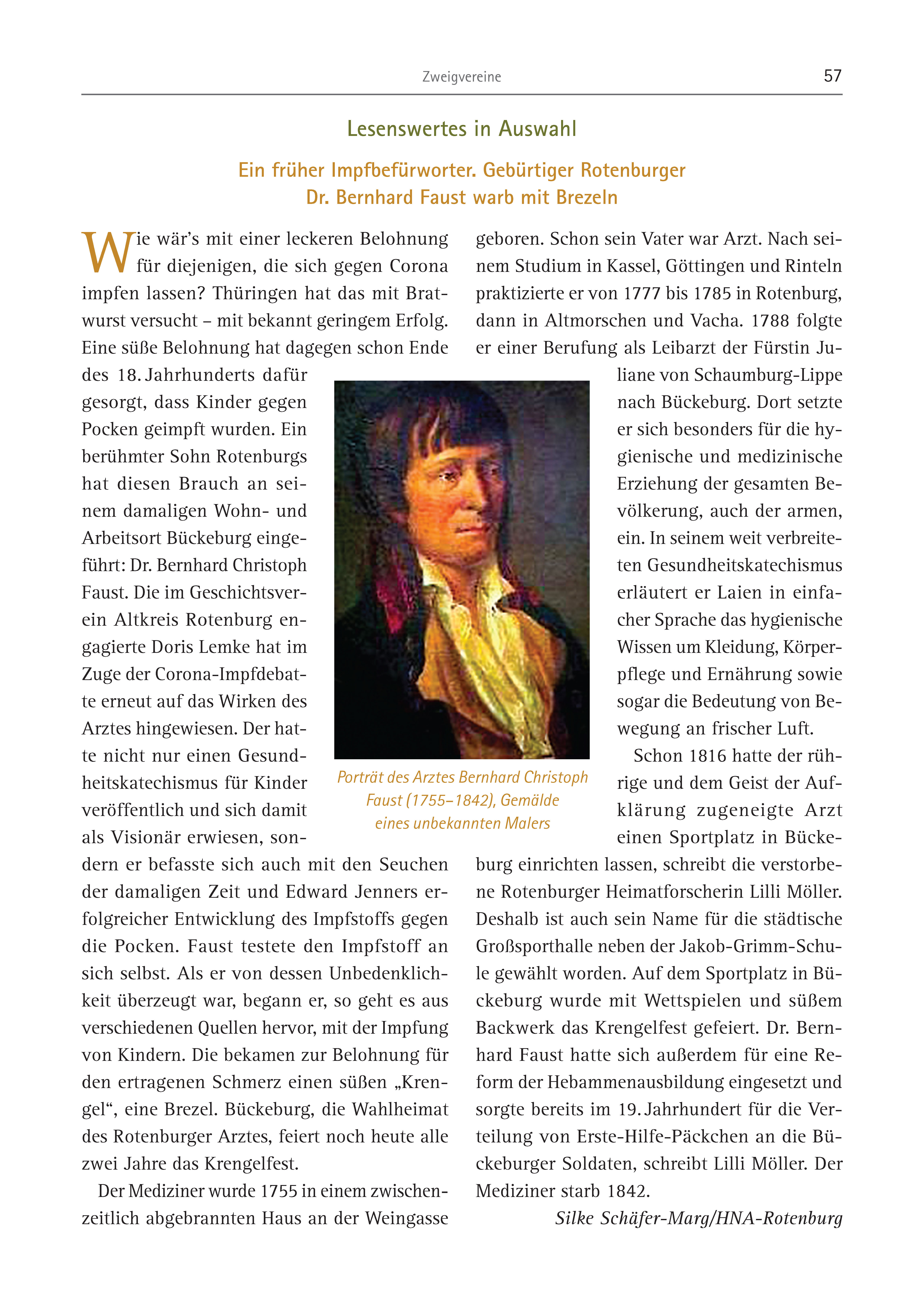 Zweigvereine 57 Wie wär’s mit einer leckeren Belohnung für diejenigen, die sich gegen Corona impfen lassen? Thüringen hat das mit Bratwurst versucht – mit bekannt geringem Erfolg. Eine süße Belohnung hat dagegen schon Ende des 18. Jahrhunderts dafür gesorgt, dass Kinder gegen Pocken geimpft wurden. Ein berühmter Sohn Rotenburgs hat diesen Brauch an seinem damaligen Wohn- und Arbeitsort Bückeburg eingeführt: Dr. Bernhard Christoph Faust. Die im Geschichtsverein Altkreis Rotenburg engagierte Doris Lemke hat im Zuge der Corona-Impfdebatte erneut auf das Wirken des Arztes hingewiesen. Der hatte nicht nur einen Gesundheitskatechismus für Kinder veröffentlich und sich damit als Visionär erwiesen, sondern er befasste sich auch mit den Seuchen der damaligen Zeit und Edward Jenners erfolgreicher Entwicklung des Impfstoffs gegen die Pocken. Faust testete den Impfstoff an sich selbst. Als er von dessen Unbedenklichkeit überzeugt war, begann er, so geht es aus verschiedenen Quellen hervor, mit der Impfung von Kindern. Die bekamen zur Belohnung für den ertragenen Schmerz einen süßen „Krengel“, eine Brezel. Bückeburg, die Wahlheimat des Rotenburger Arztes, feiert noch heute alle zwei Jahre das Krengelfest. Der Mediziner wurde 1755 in einem zwischenzeitlich abgebrannten Haus an der Weingasse geboren. Schon sein Vater war Arzt. Nach seinem Studium in Kassel, Göttingen und Rinteln praktizierte er von 1777 bis 1785 in Rotenburg, dann in Altmorschen und Vacha. 1788 folgte er einer Berufung als Leibarzt der Fürstin Juliane von Schaumburg-Lippe nach Bückeburg. Dort setzte er sich besonders für die hygienische und medizinische Erziehung der gesamten Bevölkerung, auch der armen, ein. In seinem weit verbreiteten Gesundheitskatechismus erläutert er Laien in einfacher Sprache das hygienische Wissen um Kleidung, Körperpflege und Ernährung sowie sogar die Bedeutung von Bewegung an frischer Luft. Schon 1816 hatte der rührige und dem Geist der Aufklärung zugeneigte Arzt einen Sportplatz in Bückeburg einrichten lassen, schreibt die verstorbene Rotenburger Heimatforscherin Lilli Möller. Deshalb ist auch sein Name für die städtische Großsporthalle neben der Jakob-Grimm-Schule gewählt worden. Auf dem Sportplatz in Bückeburg wurde mit Wettspielen und süßem Backwerk das Krengelfest gefeiert. Dr. Bernhard Faust hatte sich außerdem für eine Reform der Hebammenausbildung eingesetzt und sorgte bereits im 19. Jahrhundert für die Verteilung von Erste-Hilfe-Päckchen an die Bückeburger Soldaten, schreibt Lilli Möller. Der Mediziner starb 1842. Silke Schäfer-Marg/HNA-Rotenburg Lesenswertes in Auswahl Ein früher Impfbefürworter. Gebürtiger Rotenburger Dr. Bernhard Faust warb mit Brezeln Porträt des Arztes Bernhard Christoph Faust (1755–1842), Gemälde eines unbekannten Malers