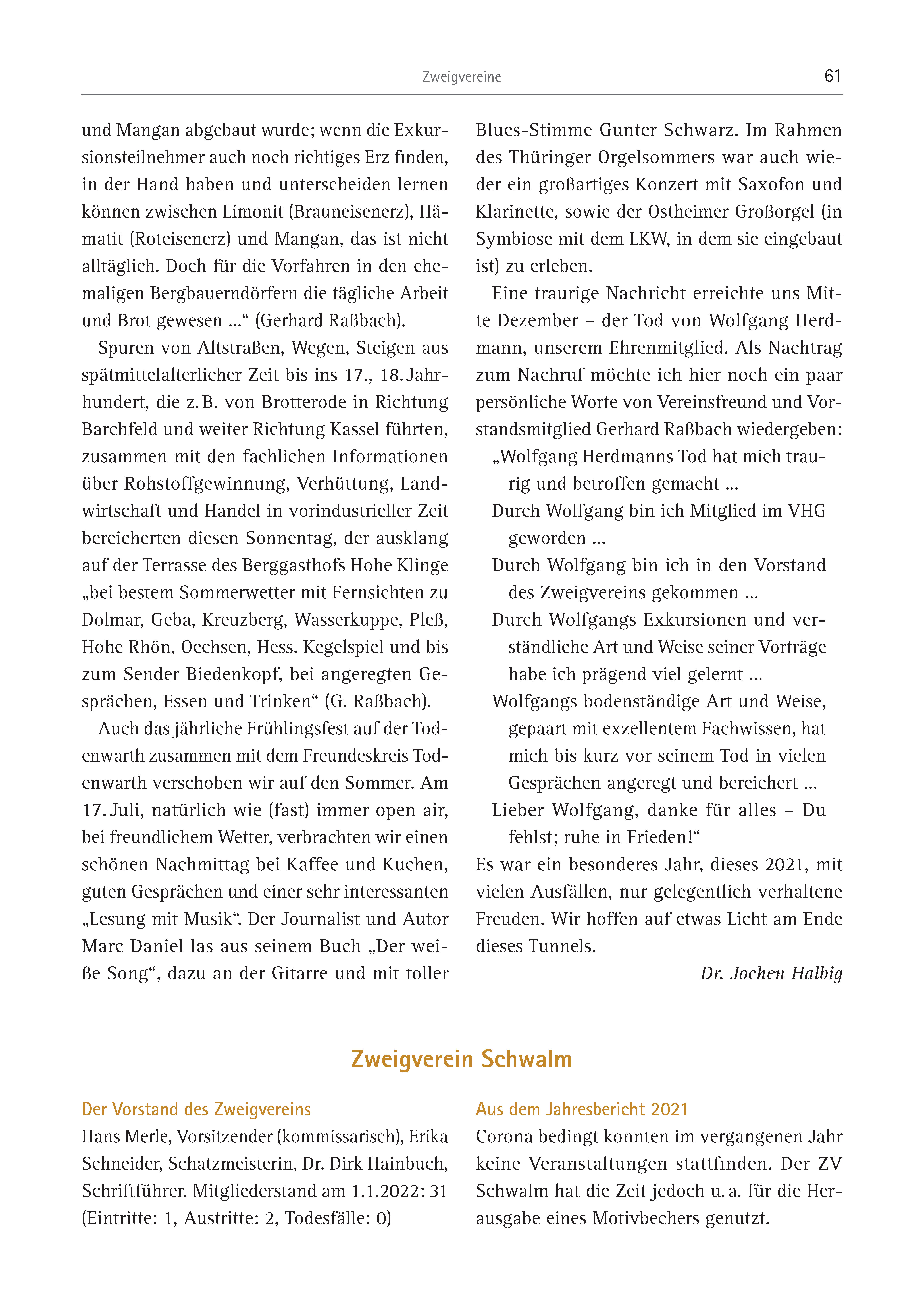 Zweigvereine 61 Der Vorstand des Zweigvereins Hans Merle, Vorsitzender (kommissarisch), Erika Schneider, Schatzmeisterin, Dr. Dirk Hainbuch, Schriftführer. Mitgliederstand am 1.1.2022: 31 (Eintritte: 1, Austritte: 2, Todesfälle: 0) Aus dem Jahresbericht 2021 Corona bedingt konnten im vergangenen Jahr keine Veranstaltungen stattfinden. Der ZV Schwalm hat die Zeit jedoch u. a. für die Herausgabe eines Motivbechers genutzt. Zweigverein Schwalm und Mangan abgebaut wurde; wenn die Exkursionsteilnehmer auch noch richtiges Erz finden, in der Hand haben und unterscheiden lernen können zwischen Limonit (Brauneisenerz), Hämatit (Roteisenerz) und Mangan, das ist nicht alltäglich. Doch für die Vorfahren in den ehemaligen Bergbauerndörfern die tägliche Arbeit und Brot gewesen …“ (Gerhard Raßbach). Spuren von Altstraßen, Wegen, Steigen aus spätmittelalterlicher Zeit bis ins 17., 18. Jahrhundert, die z. B. von Brotterode in Richtung Barchfeld und weiter Richtung Kassel führten, zusammen mit den fachlichen Informationen über Rohstoffgewinnung, Verhüttung, Landwirtschaft und Handel in vorindustrieller Zeit bereicherten diesen Sonnentag, der ausklang auf der Terrasse des Berggasthofs Hohe Klinge „bei bestem Sommerwetter mit Fernsichten zu Dolmar, Geba, Kreuzberg, Wasserkuppe, Pleß, Hohe Rhön, Oechsen, Hess. Kegelspiel und bis zum Sender Biedenkopf, bei angeregten Gesprächen, Essen und Trinken“ (G. Raßbach). Auch das jährliche Frühlingsfest auf der Todenwarth zusammen mit dem Freundeskreis Todenwarth verschoben wir auf den Sommer. Am 17. Juli, natürlich wie (fast) immer open air, bei freundlichem Wetter, verbrachten wir einen schönen Nachmittag bei Kaffee und Kuchen, guten Gesprächen und einer sehr interessanten „Lesung mit Musik“. Der Journalist und Autor Marc Daniel las aus seinem Buch „Der weiße Song“, dazu an der Gitarre und mit toller Blues-Stimme Gunter Schwarz. Im Rahmen des Thüringer Orgelsommers war auch wieder ein großartiges Konzert mit Saxofon und Klarinette, sowie der Ostheimer Großorgel (in Symbiose mit dem LKW, in dem sie eingebaut ist) zu erleben. Eine traurige Nachricht erreichte uns Mitte Dezember – der Tod von Wolfgang Herdmann, unserem Ehrenmitglied. Als Nachtrag zum Nachruf möchte ich hier noch ein paar persönliche Worte von Vereinsfreund und Vorstandsmitglied Gerhard Raßbach wiedergeben: „Wolfgang Herdmanns Tod hat mich traurig und betroffen gemacht ... Durch Wolfgang bin ich Mitglied im VHG geworden ... Durch Wolfgang bin ich in den Vorstand des Zweigvereins gekommen … Durch Wolfgangs Exkursionen und verständliche Art und Weise seiner Vorträge habe ich prägend viel gelernt … Wolfgangs bodenständige Art und Weise, gepaart mit exzellentem Fachwissen, hat mich bis kurz vor seinem Tod in vielen Gesprächen angeregt und bereichert … Lieber Wolfgang, danke für alles – Du fehlst; ruhe in Frieden!“ Es war ein besonderes Jahr, dieses 2021, mit vielen Ausfällen, nur gelegentlich verhaltene Freuden. Wir hoffen auf etwas Licht am Ende dieses Tunnels. Dr. Jochen Halbig