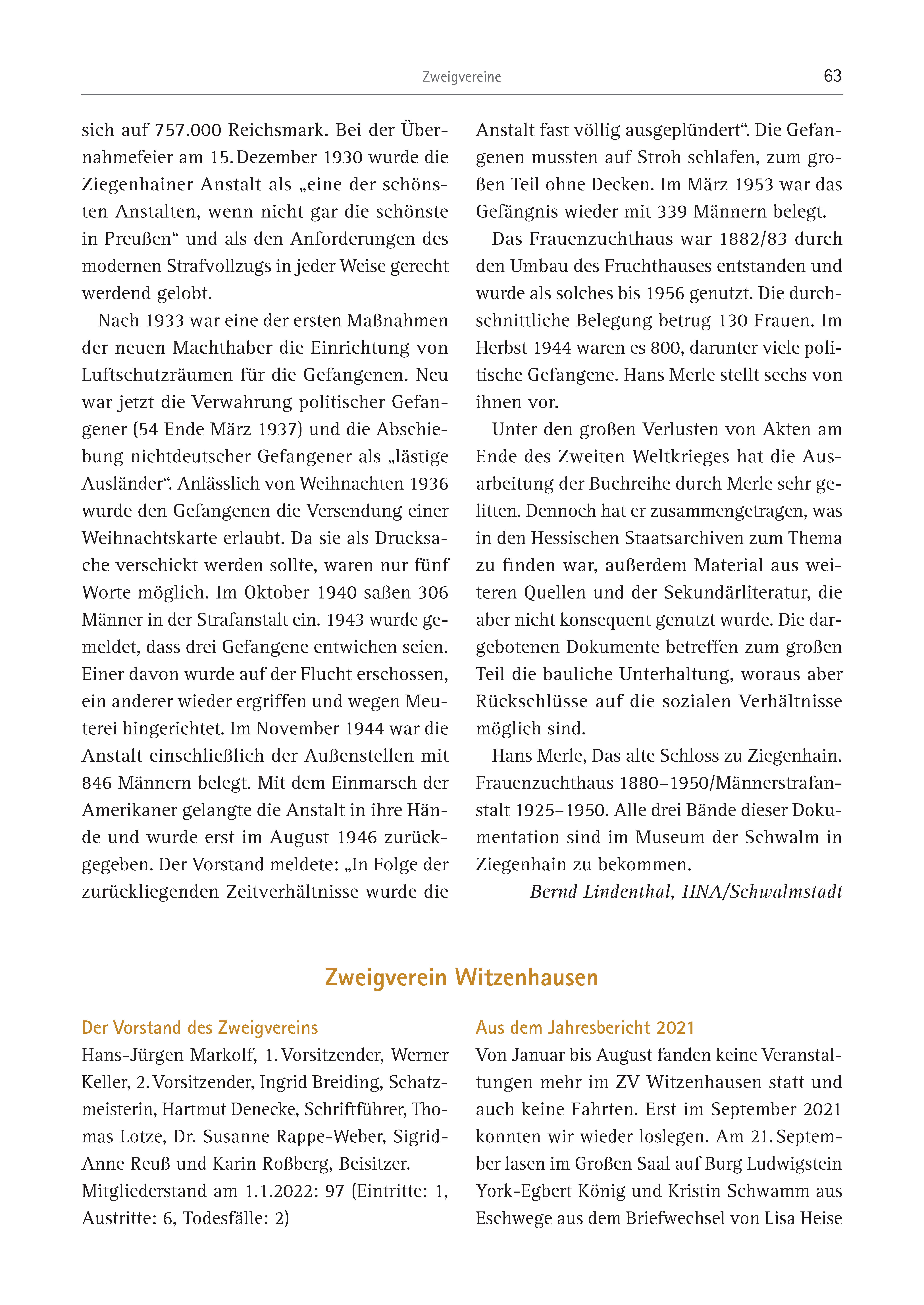 Zweigvereine 63 Der Vorstand des Zweigvereins Hans-Jürgen Markolf, 1. Vorsitzender, Werner Keller, 2. Vorsitzender, Ingrid Breiding, Schatzmeisterin, Hartmut Denecke, Schriftführer, Thomas Lotze, Dr. Susanne Rappe-Weber, Sigrid- Anne Reuß und Karin Roßberg, Beisitzer. Mitgliederstand am 1.1.2022: 97 (Eintritte: 1, Austritte: 6, Todesfälle: 2) Zweigverein Witzenhausen Aus dem Jahresbericht 2021 Von Januar bis August fanden keine Veranstaltungen mehr im ZV Witzenhausen statt und auch keine Fahrten. Erst im September 2021 konnten wir wieder loslegen. Am 21. September lasen im Großen Saal auf Burg Ludwigstein York-Egbert König und Kristin Schwamm aus Eschwege aus dem Briefwechsel von Lisa Heise sich auf 757.000 Reichsmark. Bei der Übernahmefeier am 15. Dezember 1930 wurde die Ziegenhainer Anstalt als „eine der schönsten Anstalten, wenn nicht gar die schönste in Preußen“ und als den Anforderungen des modernen Strafvollzugs in jeder Weise gerecht werdend gelobt. Nach 1933 war eine der ersten Maßnahmen der neuen Machthaber die Einrichtung von Luftschutzräumen für die Gefangenen. Neu war jetzt die Verwahrung politischer Gefangener (54 Ende März 1937) und die Abschiebung nichtdeutscher Gefangener als „lästige Ausländer“. Anlässlich von Weihnachten 1936 wurde den Gefangenen die Versendung einer Weihnachtskarte erlaubt. Da sie als Drucksache verschickt werden sollte, waren nur fünf Worte möglich. Im Oktober 1940 saßen 306 Männer in der Strafanstalt ein. 1943 wurde gemeldet, dass drei Gefangene entwichen seien. Einer davon wurde auf der Flucht erschossen, ein anderer wieder ergriffen und wegen Meuterei hingerichtet. Im November 1944 war die Anstalt einschließlich der Außenstellen mit 846 Männern belegt. Mit dem Einmarsch der Amerikaner gelangte die Anstalt in ihre Hände und wurde erst im August 1946 zurückgegeben. Der Vorstand meldete: „In Folge der zurückliegenden Zeitverhältnisse wurde die Anstalt fast völlig ausgeplündert“. Die Gefangenen mussten auf Stroh schlafen, zum großen Teil ohne Decken. Im März 1953 war das Gefängnis wieder mit 339 Männern belegt. Das Frauenzuchthaus war 1882/83 durch den Umbau des Fruchthauses entstanden und wurde als solches bis 1956 genutzt. Die durchschnittliche Belegung betrug 130 Frauen. Im Herbst 1944 waren es 800, darunter viele politische Gefangene. Hans Merle stellt sechs von ihnen vor. Unter den großen Verlusten von Akten am Ende des Zweiten Weltkrieges hat die Ausarbeitung der Buchreihe durch Merle sehr gelitten. Dennoch hat er zusammengetragen, was in den Hessischen Staatsarchiven zum Thema zu finden war, außerdem Material aus weiteren Quellen und der Sekundärliteratur, die aber nicht konsequent genutzt wurde. Die dargebotenen Dokumente betreffen zum großen Teil die bauliche Unterhaltung, woraus aber Rückschlüsse auf die sozialen Verhältnisse möglich sind. Hans Merle, Das alte Schloss zu Ziegenhain. Frauenzuchthaus 1880–1950/Männerstrafanstalt 1925–1950. Alle drei Bände dieser Dokumentation sind im Museum der Schwalm in Ziegenhain zu bekommen. Bernd Lindenthal, HNA/Schwalmstadt