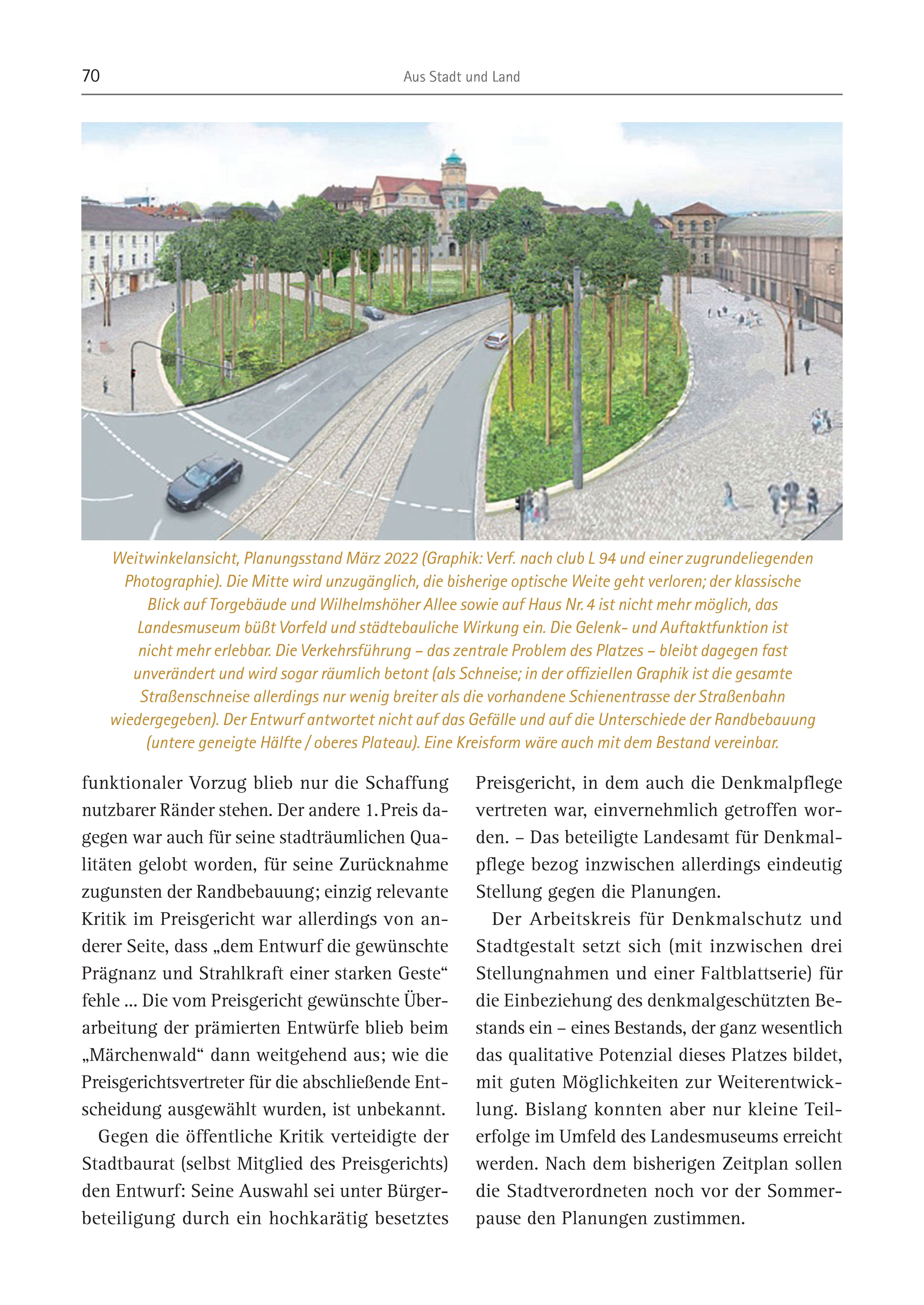 70 Aus Stadt und Land funktionaler Vorzug blieb nur die Schaffung nutzbarer Ränder stehen. Der andere 1. Preis dagegen war auch für seine stadträumlichen Qualitäten gelobt worden, für seine Zurücknahme zugunsten der Randbebauung; einzig relevante Kritik im Preisgericht war allerdings von anderer Seite, dass „dem Entwurf die gewünschte Prägnanz und Strahlkraft einer starken Geste“ fehle ... Die vom Preisgericht gewünschte Überarbeitung der prämierten Entwürfe blieb beim „Märchenwald“ dann weitgehend aus; wie die Preisgerichtsvertreter für die abschließende Entscheidung ausgewählt wurden, ist unbekannt. Gegen die öffentliche Kritik verteidigte der Stadtbaurat (selbst Mitglied des Preisgerichts) den Entwurf: Seine Auswahl sei unter Bürgerbeteiligung durch ein hochkarätig besetztes Preisgericht, in dem auch die Denkmalpflege vertreten war, einvernehmlich getroffen worden. – Das beteiligte Landesamt für Denkmalpflege bezog inzwischen allerdings eindeutig Stellung gegen die Planungen. Der Arbeitskreis für Denkmalschutz und Stadtgestalt setzt sich (mit inzwischen drei Stellungnahmen und einer Faltblattserie) für die Einbeziehung des denkmalgeschützten Bestands ein – eines Bestands, der ganz wesentlich das qualitative Potenzial dieses Platzes bildet, mit guten Möglichkeiten zur Weiterentwicklung. Bislang konnten aber nur kleine Teilerfolge im Umfeld des Landesmuseums erreicht werden. Nach dem bisherigen Zeitplan sollen die Stadtverordneten noch vor der Sommerpause den Planungen zustimmen. Weitwinkelansicht, Planungsstand März 2022 (Graphik: Verf. nach club L 94 und einer zugrundeliegenden Photographie). Die Mitte wird unzugänglich, die bisherige optische Weite geht verloren; der klassische Blick auf Torgebäude und Wilhelmshöher Allee sowie auf Haus Nr. 4 ist nicht mehr möglich, das Landesmuseum büßt Vorfeld und städtebauliche Wirkung ein. Die Gelenk- und Auftaktfunktion ist nicht mehr erlebbar. Die Verkehrsführung – das zentrale Problem des Platzes – bleibt dagegen fast unverändert und wird sogar räumlich betont (als Schneise; in der offiziellen Graphik ist die gesamte Straßenschneise allerdings nur wenig breiter als die vorhandene Schienentrasse der Straßenbahn wiedergegeben). Der Entwurf antwortet nicht auf das Gefälle und auf die Unterschiede der Randbebauung (untere geneigte Hälfte / oberes Plateau). Eine Kreisform wäre auch mit dem Bestand vereinbar.
