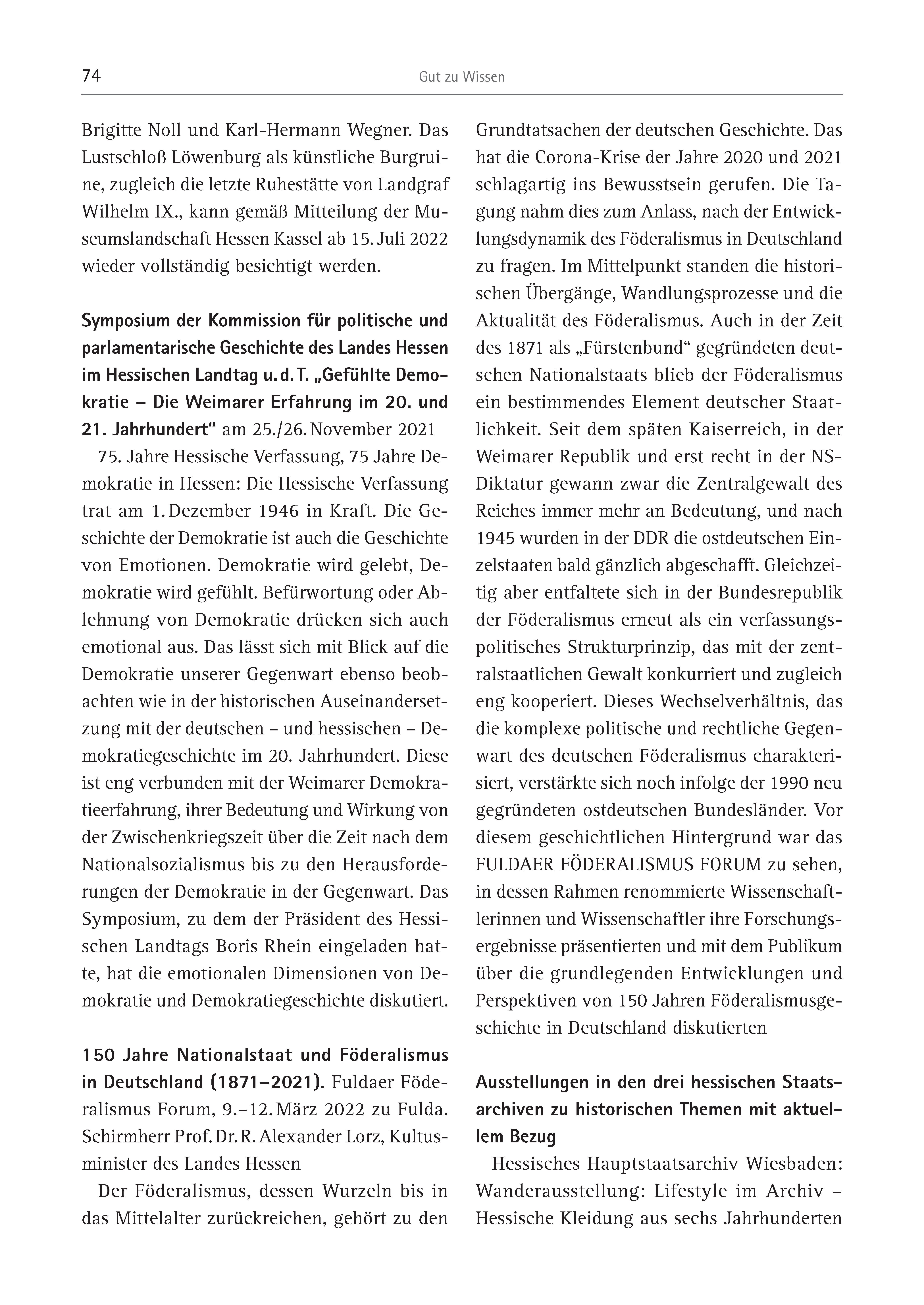74 Gut zu Wissen Brigitte Noll und Karl-Hermann Wegner. Das Lustschloß Löwenburg als künstliche Burgruine, zugleich die letzte Ruhestätte von Landgraf Wilhelm IX., kann gemäß Mitteilung der Museumslandschaft Hessen Kassel ab 15. Juli 2022 wieder vollständig besichtigt werden. Symposium der Kommission für politische und parlamentarische Geschichte des Landes Hessen im Hessischen Landtag u. d. T. „Gefühlte Demokratie – Die Weimarer Erfahrung im 20. und 21. Jahrhundert“ am 25./26. November 2021 75. Jahre Hessische Verfassung, 75 Jahre Demokratie in Hessen: Die Hessische Verfassung trat am 1. Dezember 1946 in Kraft. Die Geschichte der Demokratie ist auch die Geschichte von Emotionen. Demokratie wird gelebt, Demokratie wird gefühlt. Befürwortung oder Ablehnung von Demokratie drücken sich auch emotional aus. Das lässt sich mit Blick auf die Demokratie unserer Gegenwart ebenso beobachten wie in der historischen Auseinandersetzung mit der deutschen – und hessischen – Demokratiegeschichte im 20. Jahrhundert. Diese ist eng verbunden mit der Weimarer Demokratieerfahrung, ihrer Bedeutung und Wirkung von der Zwischenkriegszeit über die Zeit nach dem Nationalsozialismus bis zu den Herausforderungen der Demokratie in der Gegenwart. Das Symposium, zu dem der Präsident des Hessischen Landtags Boris Rhein eingeladen hatte, hat die emotionalen Dimensionen von Demokratie und Demokratiegeschichte diskutiert. 150 Jahre Nationalstaat und Föderalismus in Deutschland (1871–2021). Fuldaer Föderalismus Forum, 9.–12. März 2022 zu Fulda. Schirmherr Prof. Dr. R. Alexander Lorz, Kultusminister des Landes Hessen Der Föderalismus, dessen Wurzeln bis in das Mittelalter zurückreichen, gehört zu den Grundtatsachen der deutschen Geschichte. Das hat die Corona-Krise der Jahre 2020 und 2021 schlagartig ins Bewusstsein gerufen. Die Tagung nahm dies zum Anlass, nach der Entwicklungsdynamik des Föderalismus in Deutschland zu fragen. Im Mittelpunkt standen die historischen Übergänge, Wandlungsprozesse und die Aktualität des Föderalismus. Auch in der Zeit des 1871 als „Fürstenbund“ gegründeten deutschen Nationalstaats blieb der Föderalismus ein bestimmendes Element deutscher Staatlichkeit. Seit dem späten Kaiserreich, in der Weimarer Republik und erst recht in der NSDiktatur gewann zwar die Zentralgewalt des Reiches immer mehr an Bedeutung, und nach 1945 wurden in der DDR die ostdeutschen Einzelstaaten bald gänzlich abgeschafft. Gleichzeitig aber entfaltete sich in der Bundesrepublik der Föderalismus erneut als ein verfassungspolitisches Strukturprinzip, das mit der zentralstaatlichen Gewalt konkurriert und zugleich eng kooperiert. Dieses Wechselverhältnis, das die komplexe politische und rechtliche Gegenwart des deutschen Föderalismus charakterisiert, verstärkte sich noch infolge der 1990 neu gegründeten ostdeutschen Bundesländer. Vor diesem geschichtlichen Hintergrund war das FULDAER FÖDERALISMUS FORUM zu sehen, in dessen Rahmen renommierte Wissenschaftlerinnen und Wissenschaftler ihre Forschungsergebnisse präsentierten und mit dem Publikum über die grundlegenden Entwicklungen und Perspektiven von 150 Jahren Föderalismusgeschichte in Deutschland diskutierten Ausstellungen in den drei hessischen Staatsarchiven zu historischen Themen mit aktuellem Bezug Hessisches Hauptstaatsarchiv Wiesbaden: Wanderausstellung: Lifestyle im Archiv – Hessische Kleidung aus sechs Jahrhunderten
