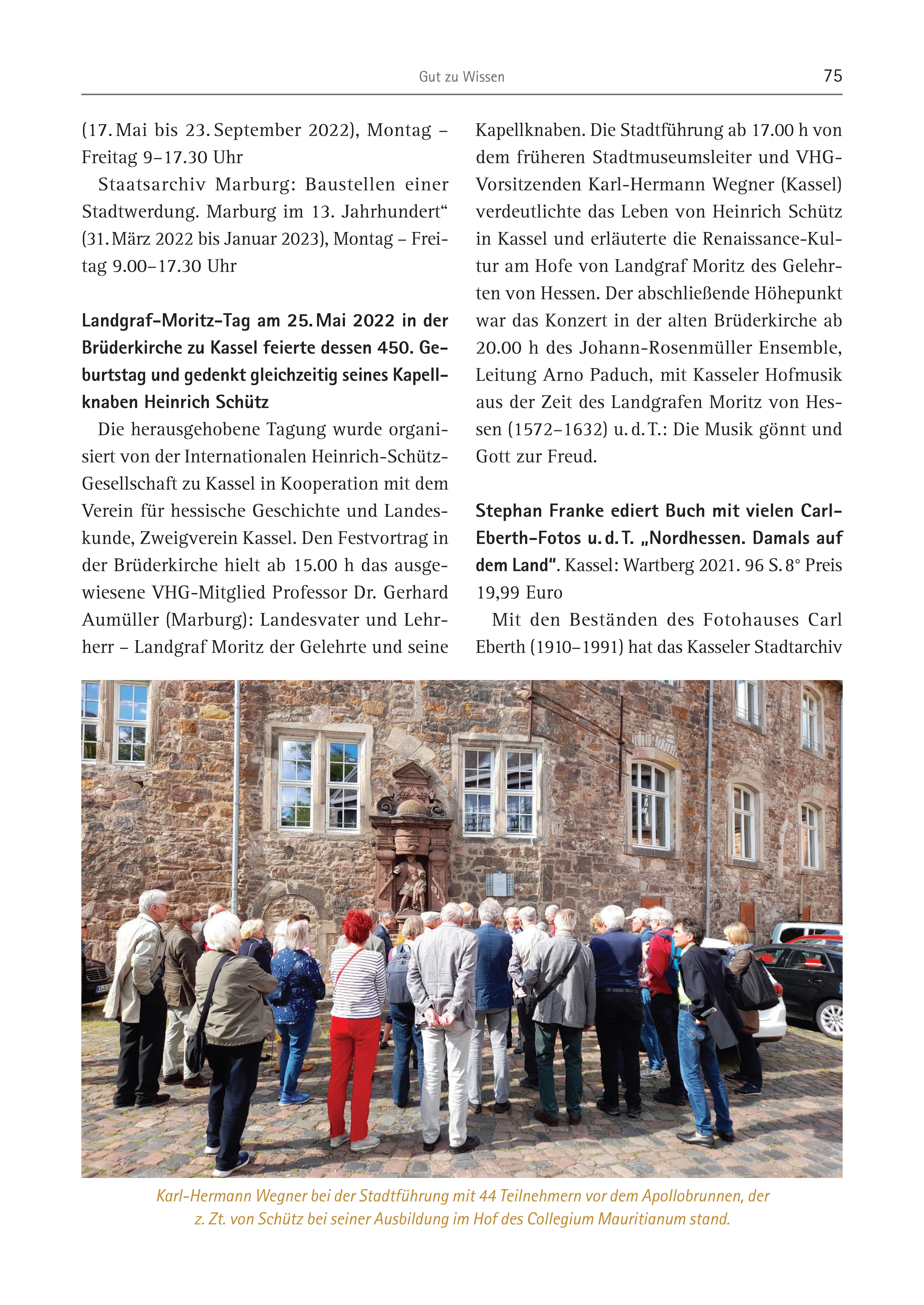 Gut zu Wissen 75 (17. Mai bis 23. September 2022), Montag – Freitag 9–17.30 Uhr Staatsarchiv Marburg: Baustellen einer Stadtwerdung. Marburg im 13. Jahrhundert“ (31. März 2022 bis Januar 2023), Montag – Freitag 9.00–17.30 Uhr Landgraf-Moritz-Tag am 25. Mai 2022 in der Brüderkirche zu Kassel feierte dessen 450. Geburtstag und gedenkt gleichzeitig seines Kapellknaben Heinrich Schütz Die herausgehobene Tagung wurde organisiert von der Internationalen Heinrich-Schütz- Gesellschaft zu Kassel in Kooperation mit dem Verein für hessische Geschichte und Landeskunde, Zweigverein Kassel. Den Festvortrag in der Brüderkirche hielt ab 15.00 h das ausgewiesene VHG-Mitglied Professor Dr. Gerhard Aumüller (Marburg): Landesvater und Lehrherr – Landgraf Moritz der Gelehrte und seine Kapellknaben. Die Stadtführung ab 17.00 h von dem früheren Stadtmuseumsleiter und VHGVorsitzenden Karl-Hermann Wegner (Kassel) verdeutlichte das Leben von Heinrich Schütz in Kassel und erläuterte die Renaissance-Kultur am Hofe von Landgraf Moritz des Gelehrten von Hessen. Der abschließende Höhepunkt war das Konzert in der alten Brüderkirche ab 20.00 h des Johann-Rosenmüller Ensemble, Leitung Arno Paduch, mit Kasseler Hofmusik aus der Zeit des Landgrafen Moritz von Hessen (1572–1632) u. d. T.: Die Musik gönnt und Gott zur Freud. Stephan Franke ediert Buch mit vielen Carl- Eberth-Fotos u. d. T. „Nordhessen. Damals auf dem Land“. Kassel: Wartberg 2021. 96 S. 8° Preis 19,99 Euro Mit den Beständen des Fotohauses Carl Eberth (1910–1991) hat das Kasseler Stadtarchiv Karl-Hermann Wegner bei der Stadtführung mit 44 Teilnehmern vor dem Apollobrunnen, der z. Zt. von Schütz bei seiner Ausbildung im Hof des Collegium Mauritianum stand.