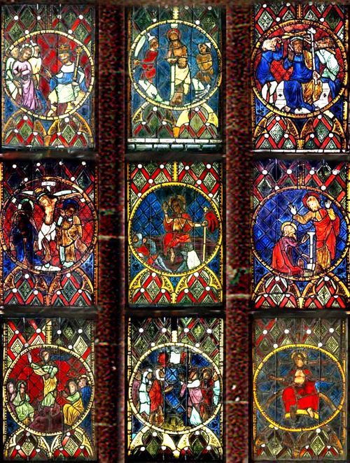 Einen regelrechten Siegeszug trat das Buntglas mit dem Übergang von der Romanik zur Gotik an: Statt dicker Mauern und kleiner Rundbogenfenster gab es kaum noch Mauern, dafür riesige Fenster, die mit Bildfeldern ausgeschmückt wurden.