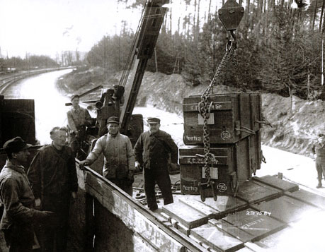 Nur durch großes Glück entging die Frankenberger Region einer Katastrophe, weil erst zwei Tage nach Einmarsch der Amerikaner die Frankenberger Luft-Munitionsanstalt im Wald bei Wiesenfeld entdeckt und kampflos übergeben wurde. Hier lagerten Kampfstoffe aller Art, insbesondere zur Abfüllung in Bomben bestimmtes Nervengas. Unter Aufsicht der US-Besatzungssoldaten wurden diese Kampfmittel geräumt (unser Foto) und entschärft, die leeren Bunker fast sämtlich gesprengt. Durch intensiven Verhandlungseinsatz von Landrat Dr. Ulrich Stapenhorst gelang es, die noch unzerstörten Produktionshallen der Munitionsanstalt zu erhalten und sie für Gewerbegründungen von vorwiegend heimatvertriebenen Familien zur Verfügung zu stellen. So entstand hier der „Industriehof“, der spätere Ortsteil Burgwald. |