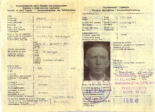 Interzonen-Reisegenehmigung für Deutsche, hier für Herrn Christoph Heerdt (ausgestellt 1946 mit französischer (1.10.1946) und sowjetischer (21.9.1946) Passiergenehmigung über die Grenzen der Besatzungszonen hinaus durch den amerikanischen Stadtkommandanten Theodore Switty und Administrative Officer Kork, gültig bis 10.10.1947). |
