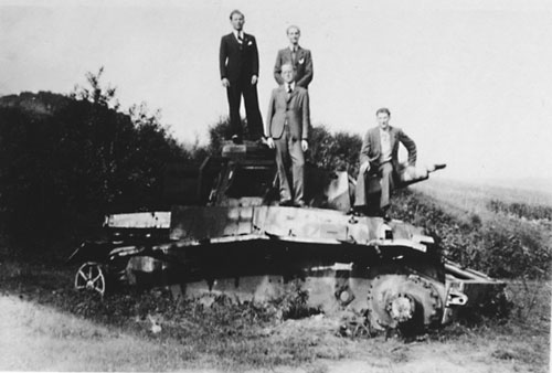 | Konfirmanden des Konfirmationsjahrganges 1944 auf einem zerstörten Wehrmachtspanzer bei Wölfershausen. |
