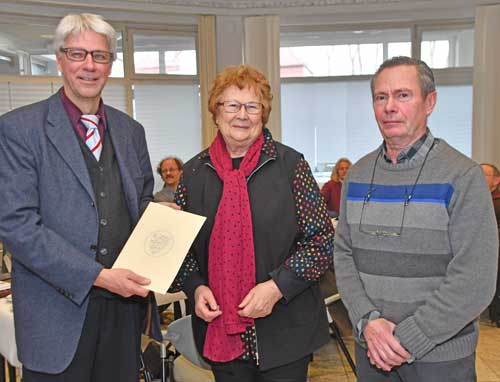 Ehrung von Frau Gudrun Bürger, Schatzmeisterin des ZV Hess. Lichtenau, anlässlich ihrer 25-jährigen Mitgliedschaft im VHG (links Dr. Dirk Richhardt, Vorsitzender des VHG, rechts Herr Wolfgang Schröder, 2. Vorsitzender des ZV Hess. Lichtenau)