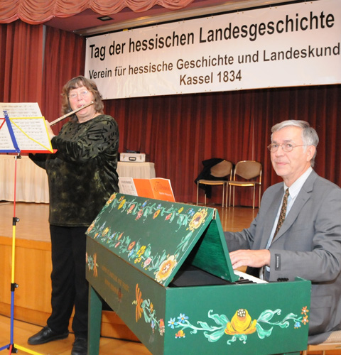 Zu Beginn der Veranstaltung hatte VHG-Vorsitzender Wegner die Mitglieder Dipl. Ing. Veronika Jäger (Hofgeismar) und Rektor a. D. Karl-Hermann Völker (Frankenberg) für langjährige verdienstvolle Tätigkeit im Verein für hessische Geschichte und Landeskunde mit der goldenen Ehrennadel ausgezeichnet. Musik von Philipp Telemann, gespielt von Dr. Jörg-Dieter und Gudrun Schollmeyer, gab der Jahrestagung eine besonders festliche Note. |