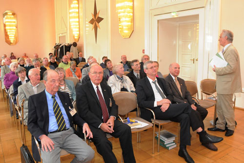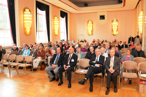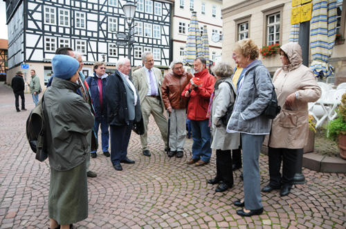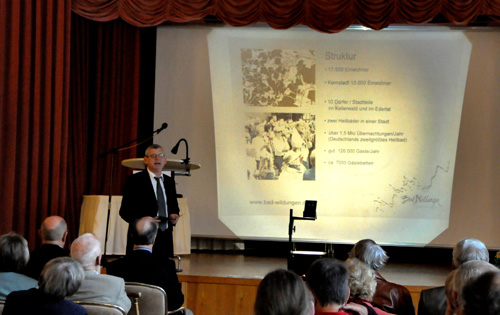 Eingeführt in die Geschichte der Badestadt wurden die Geschichtsfreunde von Bürgermeister Volker Zimmermann. Er schilderte mit Bildern die Entwicklung von der hölzernen Rohrleitung 1378 zwischen Sauerbrunnen und Marktkump bis zur modernen „Stadt der Gesundheit“ mit Europas größtem Kurpark. Ergänzt wurde er durch Dr. Wolfgang Fischer, der als Vorsitzender der Bezirksgruppe Bad Wildungen des Waldeckischen Geschichtsvereins zusammen mit Siegfried Pietrzak (Melsungen) den Tagungsort vorbereitet hatte. „Wir nehmen Sie mit Freuden auf – ist das nicht endlich mal eine gelungene Integration?“ fragte der Waldecker Dr. Fischer schmunzelnd seine kurhessischen Gäste. |