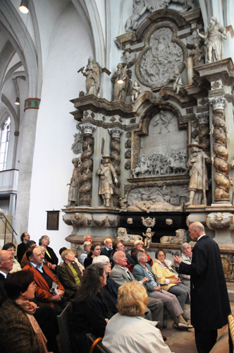 | Dr. Fischer erläutert die Bilder auf dem Altar des Conrad von Soest in der Stadtkirche. |