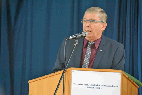 Der Festredner Dr. Reiner Braun aus Homberg (Efze) vor einem Modell der Festung. Foto: Karl-Hermann Völker