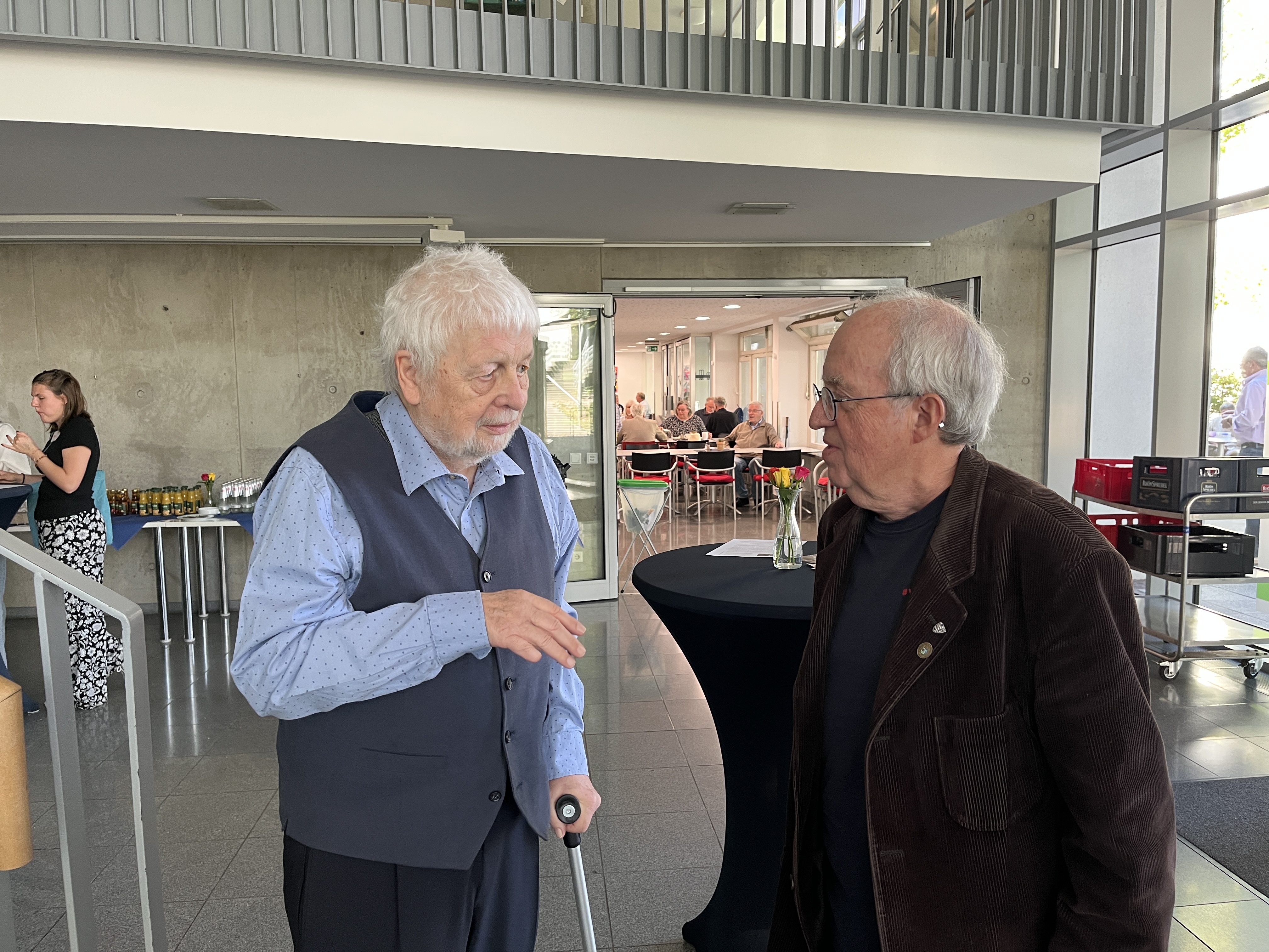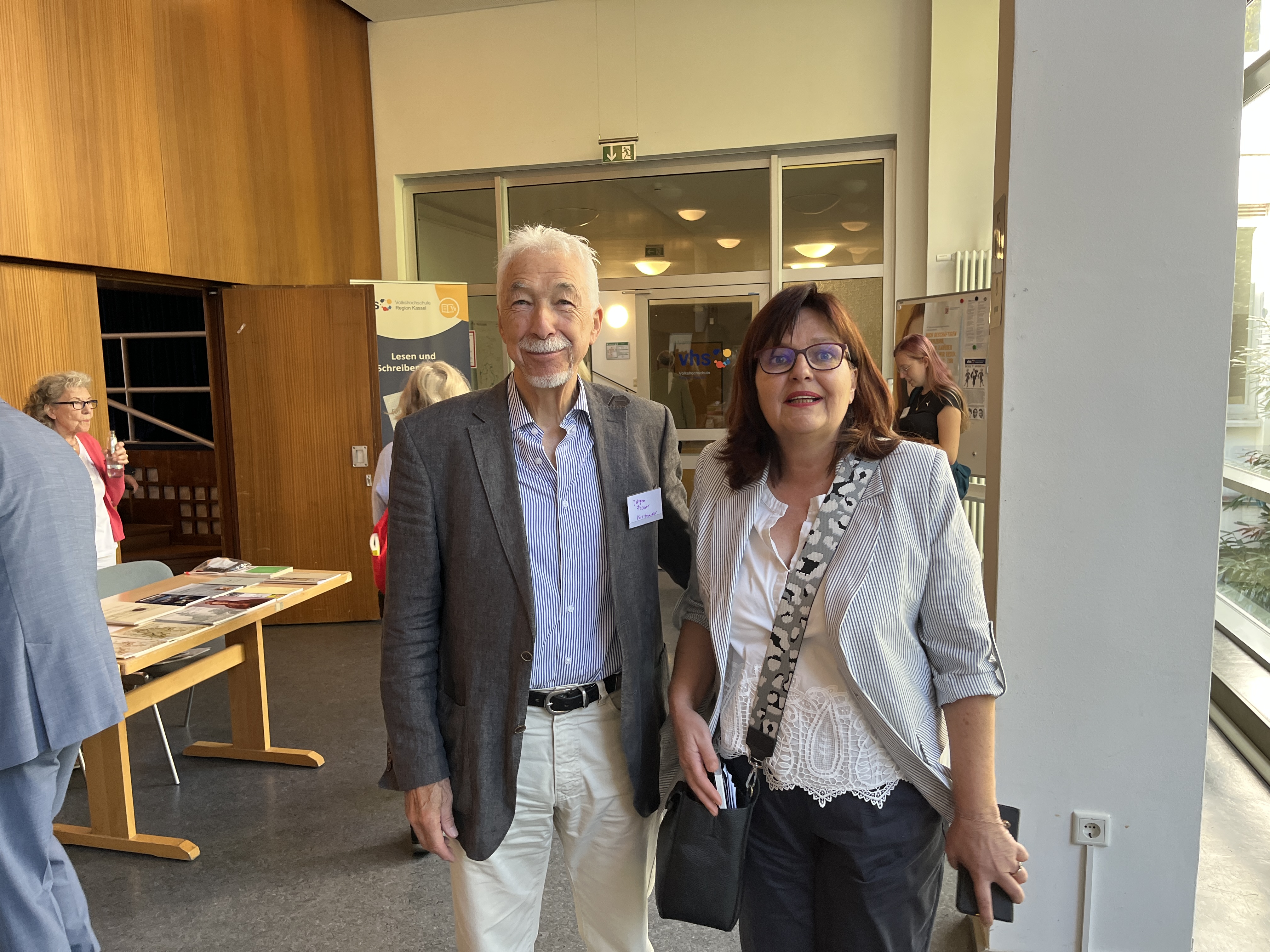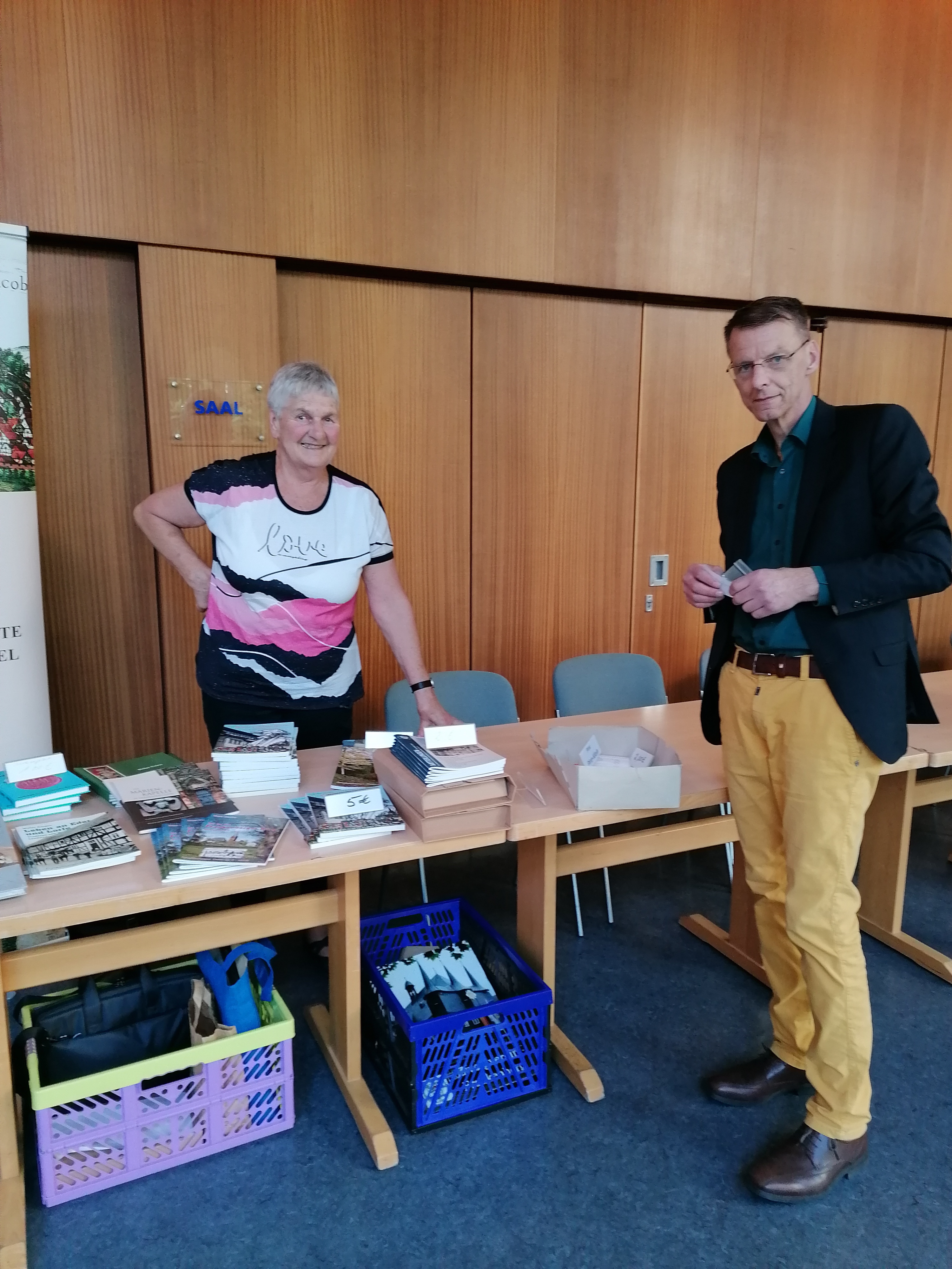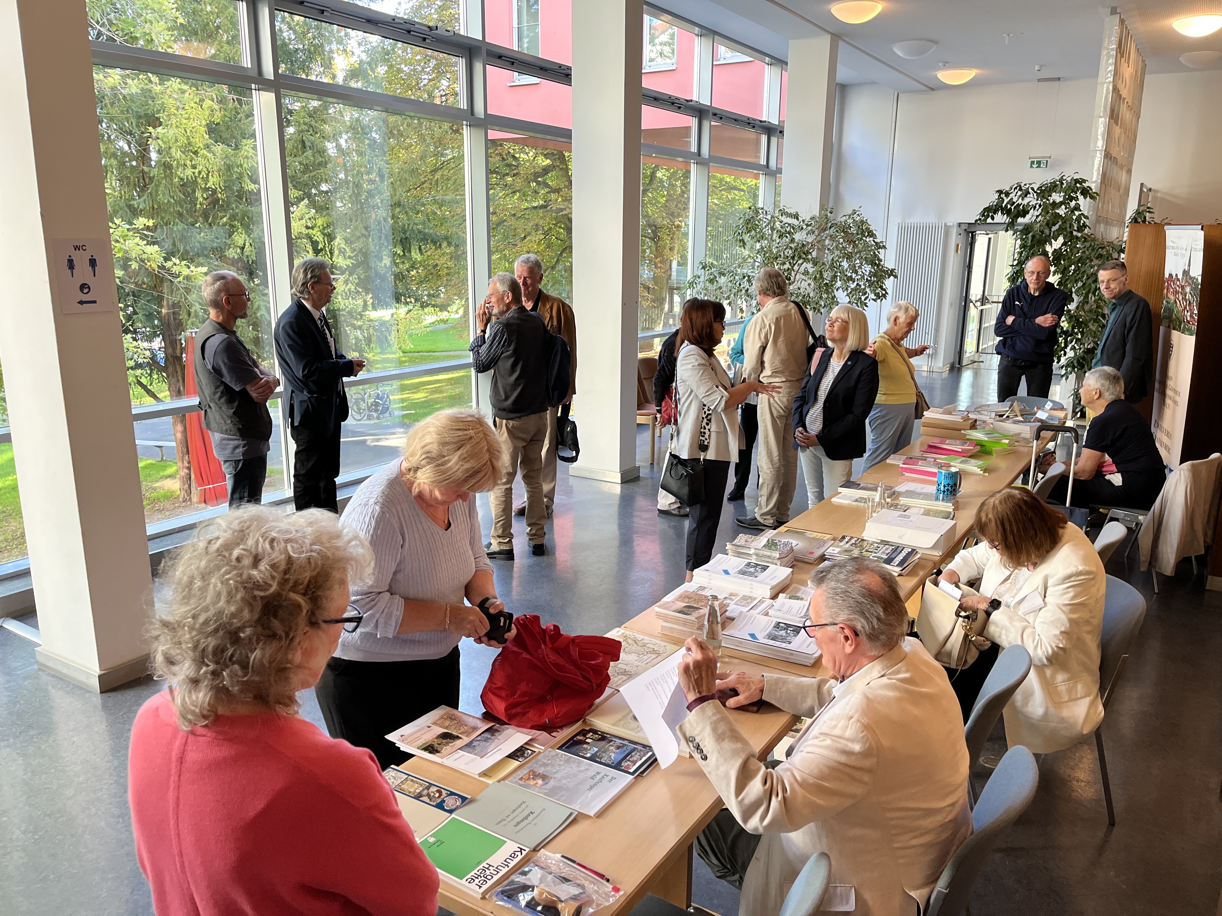 | Büchertisch des Zweigvereins Kassel im Foyer der Volkshochschule Region Kassel; Prof. Dr. Dietfrid Krause-Vilmar und Dr. Karl Kollmann im Gespräch |