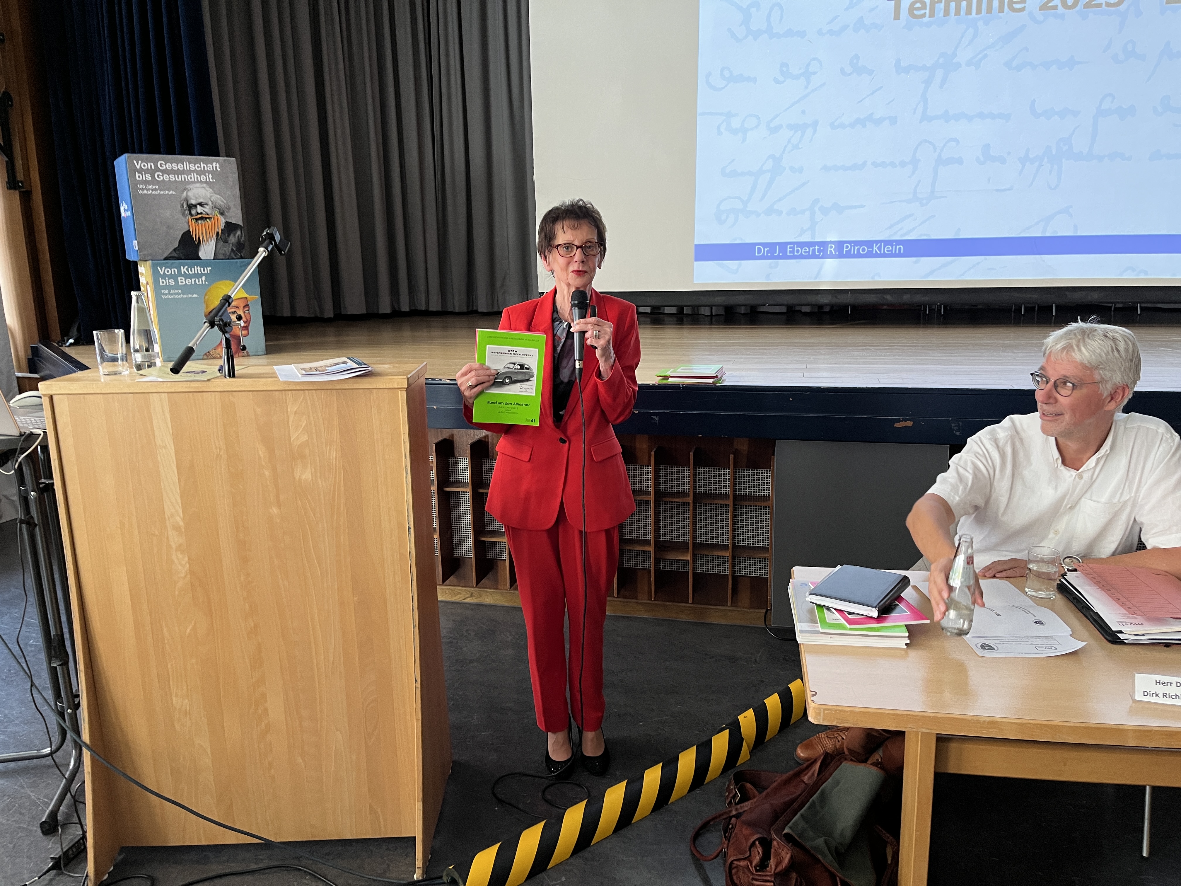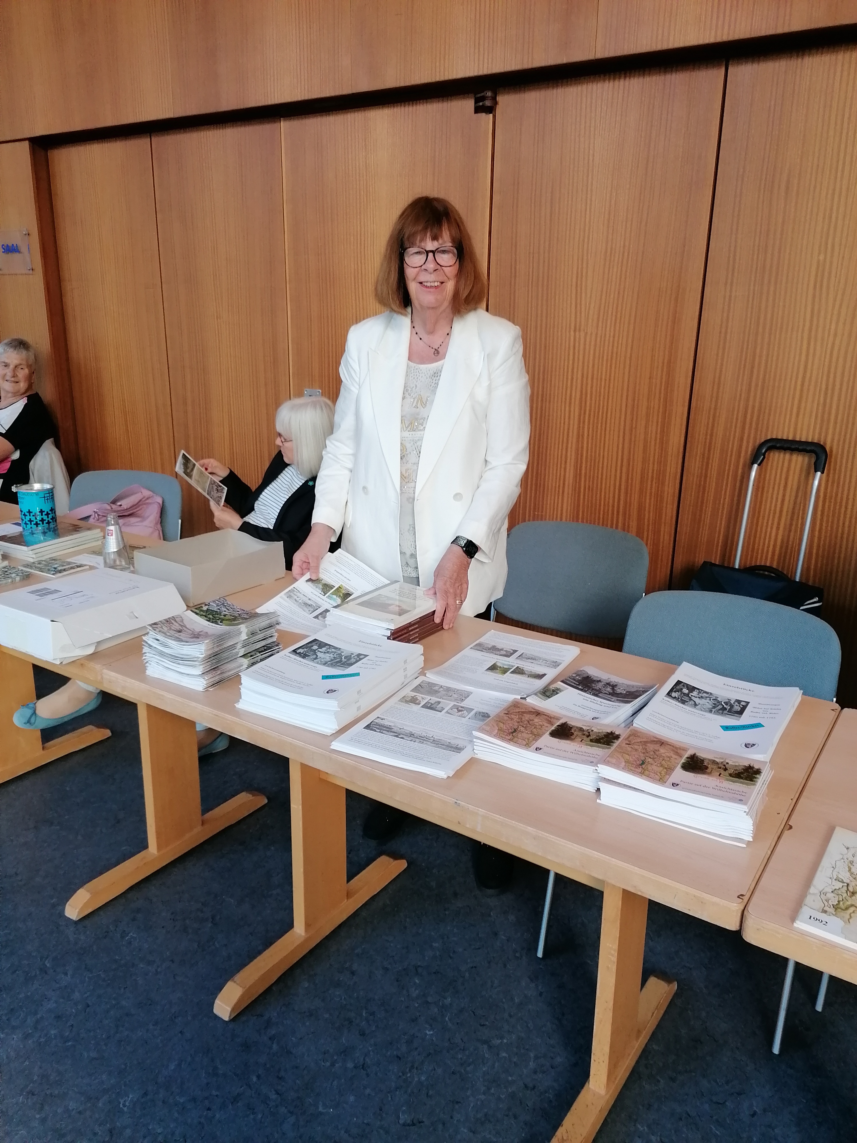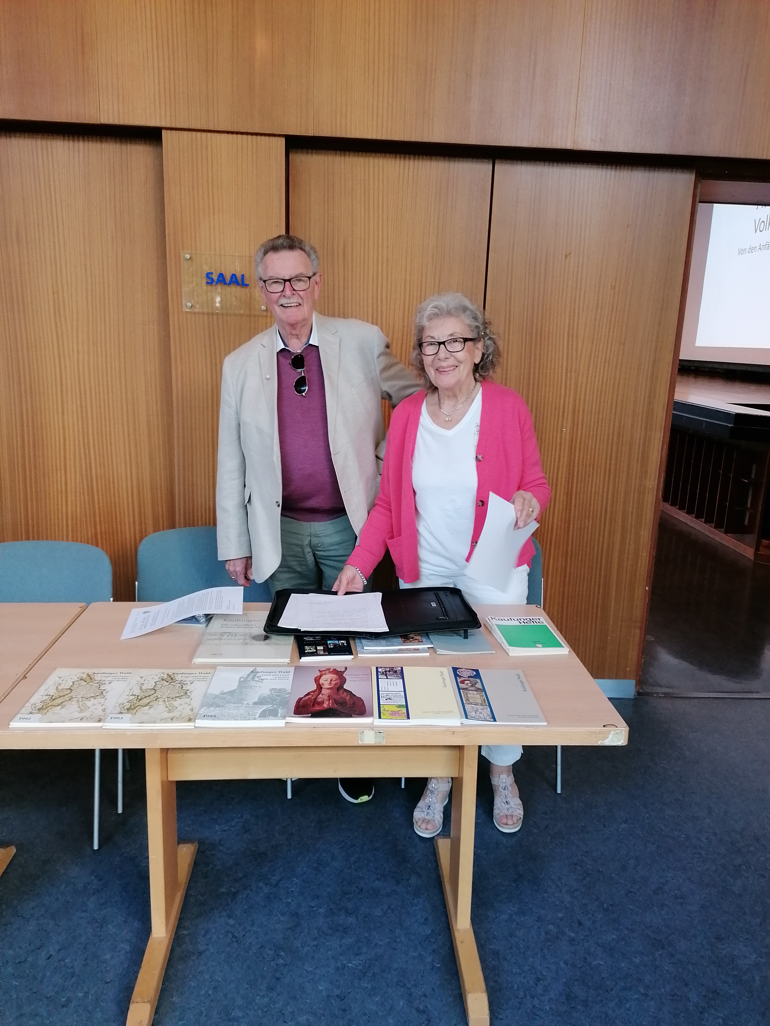| Ruth Piro-Klein präsentiert Publikationen der Zweigvereine (links); Dr. Karl Kollmann berichtet über die Planung des Tags der hessischen Landesgeschichte 2024 in Eschwege |