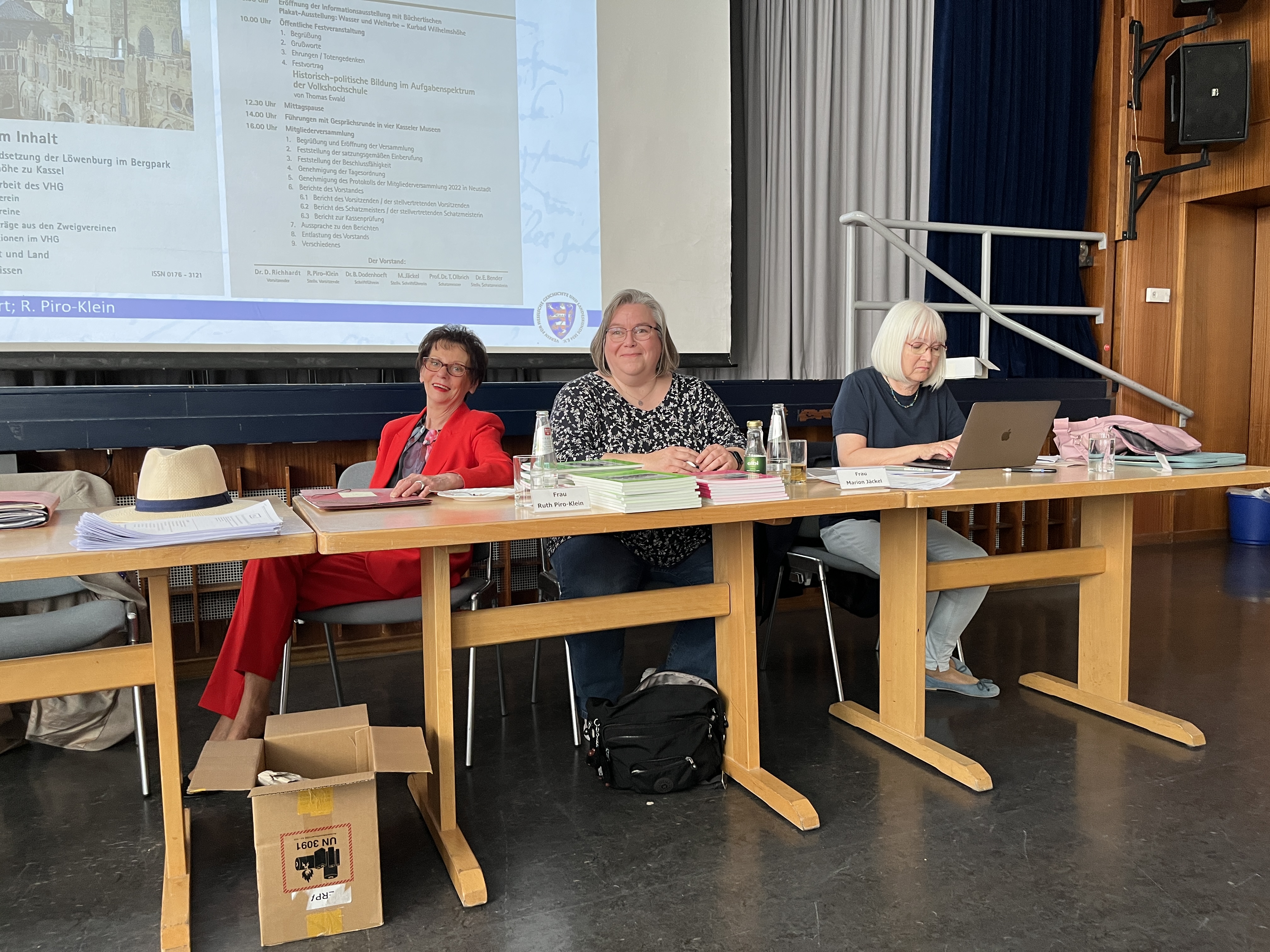 | Mitgliederversammlumg an Nachmittag: Ruth Piro-Klein, Marion Jäckel und Dr. Bettina Dodenhoeft vom Vorstand des Vereins für hessische Geschichte und Landeskunde (links); Jahresbericht von Dr. Drik Richhardt (rechts) |