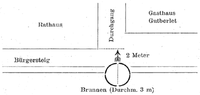 - 83 - (vergl. Mitteilungen des Vereins für 1905) sind im Jahre 1906 die Grundkarten Sektion Uslar-Kassel und „ Melsungen-Hersfeld erschienen und zum Preise von- 45 Pfennig für das Stück (bei Abnahme größerer Anzahl billiger) vom Vereinsvorstand zu beziehen. Die Grundkarte Sektion Eschwege-Eisenach wird im Laiife des Jahres 1907 herausgegeben werden. III. Berichte der Pfleger. Von dem Pfleger des Vereins, Herrn Karl Hirschfeld zu Neukirchen, Kreis Ziegenhain, ist uns nachstehender Bericht übersandt worden. 1) Vom Oktober v. J. bis Februar d. J. sind bei den Erdarbeiten für eine Wasserleitung der Stadt Neukirchen einige Reste aus älterer Zeit aufgedeckt worden. Zunächst fand sich beim Rathaus, zum größeren Teil unter der heutigen Niederrheinischen Straße ein gut ausgemauerter Brunnen von etwa 3 m Durchmesser und 13 m Tiefe, mit 3 m Wasserstand. Die Ausmauerung begann 600 mm unter der Oberfläche der jetzigen Straße und war mit starken Bohlen zugedeckt. Hierauf war ein flaches Gewölbe aufgeführt, auf welches die Packung der Straße gelegt war. Trotzdem die Niederrheinische Straße erst in den 30er Jahren des vorigen Jahrhunderts gebaut ist, war doch von diesem Brunnen in Neukirchen nichts mehr bekannt. Er ist jetzt ausgefüllt worden. Seine Lage wird durch nachstehende Skizze bestimmt: