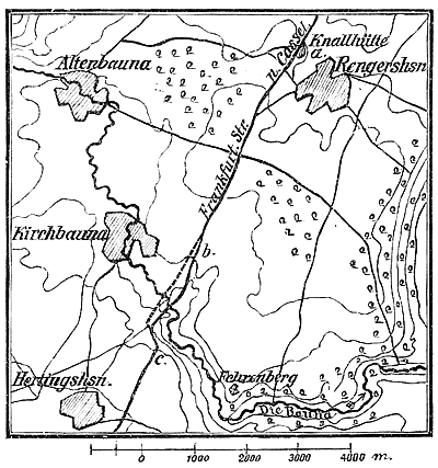 Die punktierte Straßenstrecke war 1809 noch nicht vorhanden. Wirtshause1) , ankam, erhielt sie plötzlich Feuer. In Kassel hatte man spät am Abend des 22. von dem Anrücken der Aufständischen Meldung erhalten, worauf am 23. morgens gegen 3 Uhr General Rewbell mit __________ 1) Punkt a des Plans. |