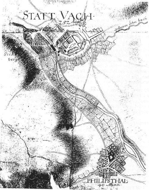 Abriß von der „Hochfürstl. Hess. Land und PostSTRASSE" aus dem Jahre 1723. (Quelle: StAM Karten PII 15.585/1 Straßen Hessen)