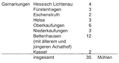 „Mühle vor der Neustadt", die im Jahre 1377 der Maria-Magdalena-Kirche verkauft wurde und 1380 unter der Bezeichnung „Hellenmole" erscheint (in der Nähe liegen Hellenwerder und Helleberg). Seit dem Jahre 1516 ist sie als „Pulvermühle" bekannt; 1520 führt sie in Verbindung mit einer Schmiede den Namen „Ysermohle" (Eisenmühle). Die Mühle war ein einstöckiges Gebäude mit hohem Dache; auf der Südwestseite war ein breites Radhaus vorgelegt, und hier zweigte der Mühlenkanal vom Hauptarm der Losse ab. In den kleinen Gebäuden auf dem Grundstück wurden die Pulvervorräte aufbewahrt. Auch die Pulvermühle wurde 1762 von den Franzosen zerstört; als herrschaftlicher Besitz wurde sie nach ihrer Wiederherstellung erneut in Erbpacht vergeben. 1809 übernahm Ernst Koch den Betrieb als Pulvermüller auf eigene Rechnung. Diese „Kochsche Pulverfabrik" bereitete alle Arten von Schießpulver und besaß die ausschließliche Lieferung für die kurhessische Armee. Ernst Koch gründete auf dem Gelände auch eine Fabrik für Gips und Wasserzement für den von ihm erfundenen sog. „Hessischen Zement". Anfang der 90er Jahre des letzten Jahrhunderts wurde das Grundstück von der Bierbrauerei Gebr. Sumpf erworben, deren Nachfolger seit 1897 die Herkulesbrauerei ist (heute Binding Brauerei an der Hafenstraße). An die „Pulvermühle" erinnert heute der „Pulvermühlenweg", eine Verbindungsstraße zwischen Hafenstraße und Sommerweg hinter der Justizvollzugsanstalt. Als der Fuldahafen am 1. August 1985 eröffnet wurde, erhielt der bisherige „Pulvermühlenweg" den Namen „HafenStraße". Diese Zusammenstellung führt 35 Mühlen im Lossetal an, und zwar in den