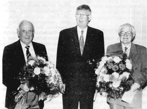 Zu Ehrenmitgliedern wurden in Melsungen wegen besonderer Verdienste um die hessische Geschichtsforschung Dr. Alfred Schalk aus Eschwege (links) und Dr. Dieter Großmann aus Marburg (rechts) ernannt. Für seine engagierte Arbeit und zehnjährige, erfolgreiche Leitung des Vereins für hessische Geschichte wurde Dr. Hans-Jürgen Kahlfuß (Mitte) mit der Goldenen Ehrennadel ausgezeichnet. (Foto: Völker)