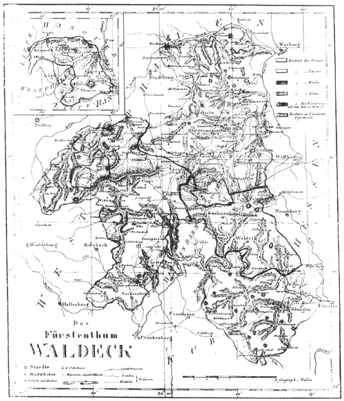Die vor 175 Jahren in einem Weimarer Verlag erschienene Karte zeigt das Fürstentum Waldeck. Der Landesteil Pyrmont (l. o.) war bereits 1922 „aus dem waldeckischen Staatsverband herausgelöst und dem Kreis Hameln zugeteilt" (Demandt) worden (Die Karte stellte dankenswerterweise das Archiv des Waldeckischen Geschichtsvereins in Bad Arolsen zur Verfügung)