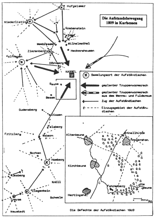 nach Auswertung der Berichte von Dörnbergs und Baumanns müssen aber drei Gefechte stattgefunden haben: - eines an der "Knallhütte" (A) - eines auf der Hertingshäuser Heide (C) und - eines im Tal der Bauna (B) An der „Knallhütte" wie an der Bauna scheint es tatsächlich zu Kampfhandlungen gekommen zu sein; angesichts der regulären französischen und westfälischen Truppen auf der Hertingshäuser Heide jedoch entliess von Dörnberg die Aufständischen, um sie nicht schutzlos einem Feuergefecht auszusetzen.