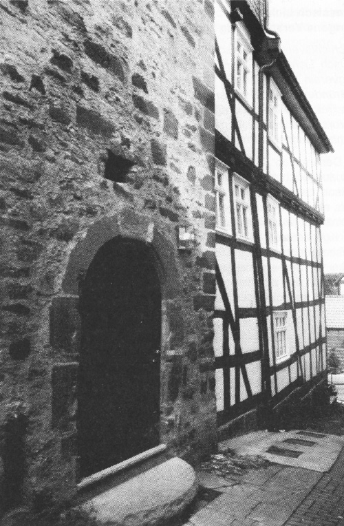 Ein Rundbogenportal mit der Jahreszahl 1568 bestimmt das Bild des wesentlich älteren Steinturmes, in dem das Stadtarchiv untergebracht ist Der ZV Frankenberg „bewohnt" die obere Etage des angrenzenden Fachwerkhauses (rechts). (Foto: Völker)