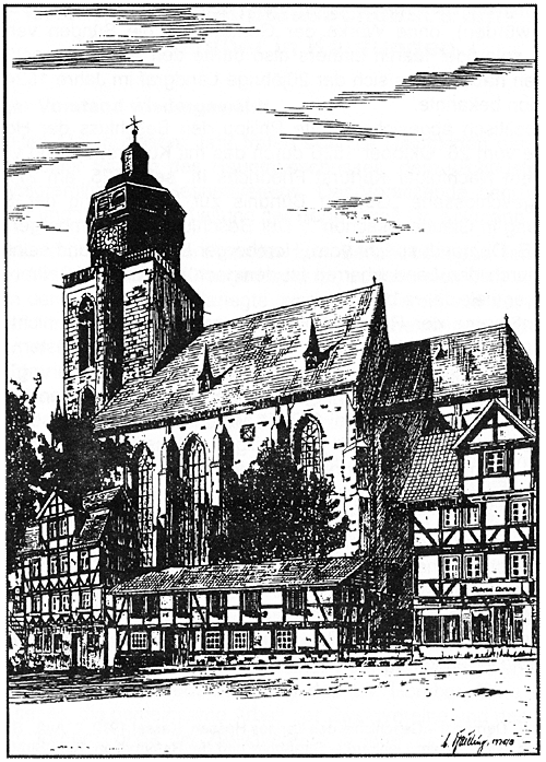 Die ehemalige Kirche St. Maria zu Homberg an der Efze, heute Ev. Stadtkirche. In der gotischen Kirche „hessischen Hallentyps“ (Dehio) aus der Zeit um 1400 - die „Welsche Haube“ auf dem oktogonalen Aufsatz erhielt der Turm nach den Verwüstungen während des 30jährigen Krieges im 18. Jahrhundert - tagte im Jahre 1526 unter Landgraf Philipp die „Homberger Synode“, die die Einführung der Reformation in Hessen beschloss. (Die Radierung stellte Herr Breiding, Homberg, zur Verfügung)