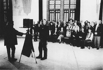 Bickell-Kolloquium 1.12.2001: Dieter Schumacher und Dr. Brigitte Walbe fotografieren die Teilnehmer im Schlosssaal mit der Plattenkamera. Foto: K. -H. Völker Auf die enge Zusammenarbeit Bickells mit dem Verein für hessische Geschichte und Landeskunde, dessen Mitglied er 1869 geworden war, wies Dr. Hans-Jürgen Kahlfuß (Kassel), Vorsitzender des Geschichtsvereins, hin. Als unermüdlicher Sammler habe der Marburger Konservator dem Verein für Landesgeschichte einen wahren „Schatz“ an Kulturgütern und Fotos hinterlassen. Dr. Jürgen Wittstock, Leiter des Marburger Universitätsmuseums, der später auch zusammen mit Dr. Cornelia Dörr im Landgrafenschloss einige von Bickells „vaterländischen Altertümern" zeigte, nannte das Werk Bickells zukunftsweisend und weit über seine Zeit hinausreichend. Am Nachmittag machten die Tagungsteilnehmer dann eigene Erfahrungen mit dem Lebensraum Bickells in Marburg. Der Hausforscher Angus Fowler führte sie durch die verwinkelte Altstadt und zeigte Gebäude, in denen der Gelehrte gelebt hat, so auch die Kugelgasse 1, wo der Konservator in einem Anbau sein Fotoatelier eingerichtet hatte. Über die 139 Stufen der nach ihm benannten Bickell-Treppe (Professor Neumann: „Wie